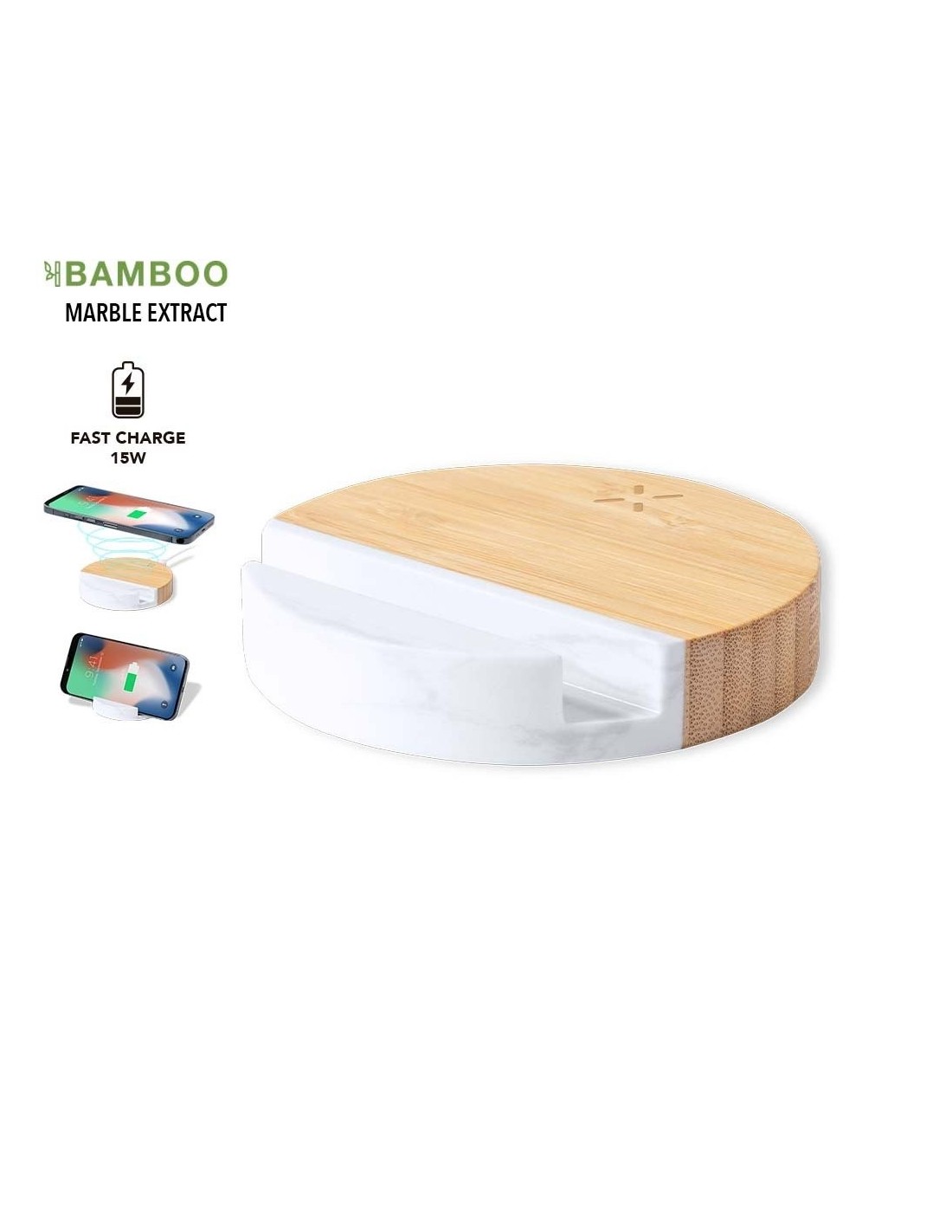 Cargador inalámbrico 15W con soporte para smartphone integrado. De diseño circular y fabricado en materiales naturales: base en bambú, con soporte en extracto de mármol. Compatible con dispositivos equipados con tecnología de carga inalámbrica Qi. Incluye cable cargador Tipo C y manual de instrucciones en español e inglés. Presentado en caja individual de diseño kraft. Fabricado conforme a los estándares RoHS y en cumplimiento con los siguientes requisitos de seguridad: Sistema de protección contra sobrecalentamiento. Sistema de protección contra sobrecarga. Sistema de bloqueo para evitar cortocircuitos.