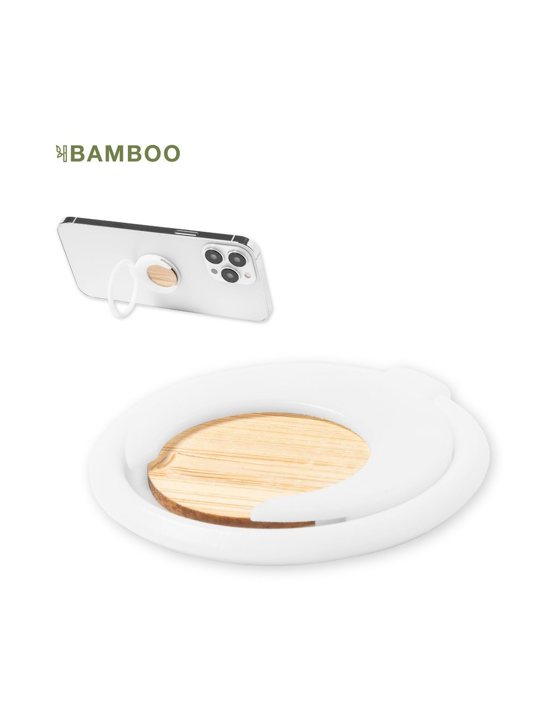 Soporte multifunción para smartphone, con moneda para carro de la compra integrada y anilla/soporte plegable. Cuerpo fabricado en resistente ABS de acabado blanco, con moneda en bambú. Con adhesivo de fijación extra fuerte y libre de residuos al despegarlo del dispositivo.