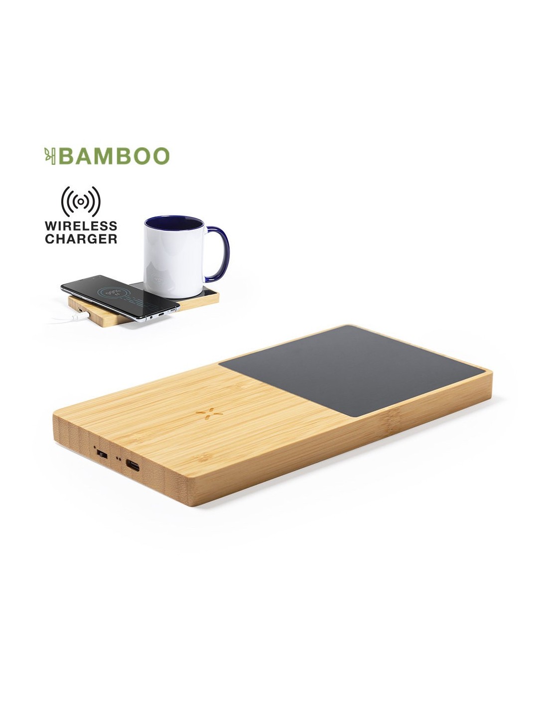 Calentador de tazas de línea nature, con cargador inalámbrico integrado 10W. Fabricado en bambú, con una amplia superficie que permite calentar la taza y cargar el dispositivo simultáneamente. Compatible con dispositivos equipados con tecnología de carga inalámbrica Qi. Incluye cable de carga Tipo C de 1 m y base antideslizante. Con manual de instrucciones en español e inglés y presentado en caja individual de diseño kraft. Fabricado conforme a los estándares RoHS y en cumplimiento con los siguientes requisitos de seguridad: Sistema de protección contra sobrecalentamiento. Sistema de protección contra sobrecarga. Sistema de bloqueo para evitar cortocircuitos. Sistema de transferencia de carga constante, acorde a la capacidad del dispositivo de destino.