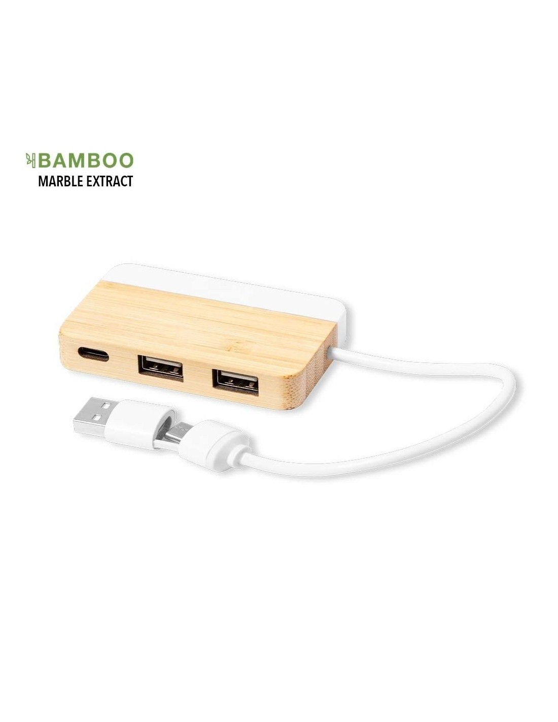 Puerto USB 2.0 de línea nature. Fabricado en bambú, con detalle en extracto de mármol. Incluye puerto Tipo C y 2 puertos USB, con entrada dual USB/Tipo C. Presentado en caja individual de diseño kraft. Fabricado conforme a estándares RoHS, con sistema de bloqueo para evitar cortocircuitos.