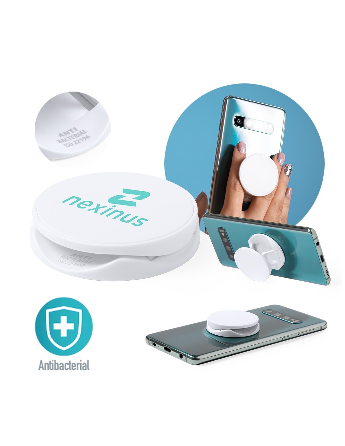 Soporte antibacteriano para smartphone. Diseño plegable en elegante acabado de color blanco, especialmente diseñado para marcaje en tampografía. Con adhesivo 3M, de fijación extra fuerte y libre de residuos al despegarlo del dispositivo. Los productos con tratamientos antibacterianos son capaces de reducir drásticamente las cargas bacterianas presentes en las superficies de los materiales, gracias a la incorporación de agentes microbianos permanentes estáticos, con alta efectividad para inhibir y prevenir la contaminación bacteriana. Artículo de acuerdo al estándar ISO 22196, que determina la actividad antibacteriana en materiales plásticos y superficies no porosas, lo que permite conocer la efectividad de inhibición microbiana que tienen los aditivos sobre los objetos tratados mediante una evaluación cuantitativa.