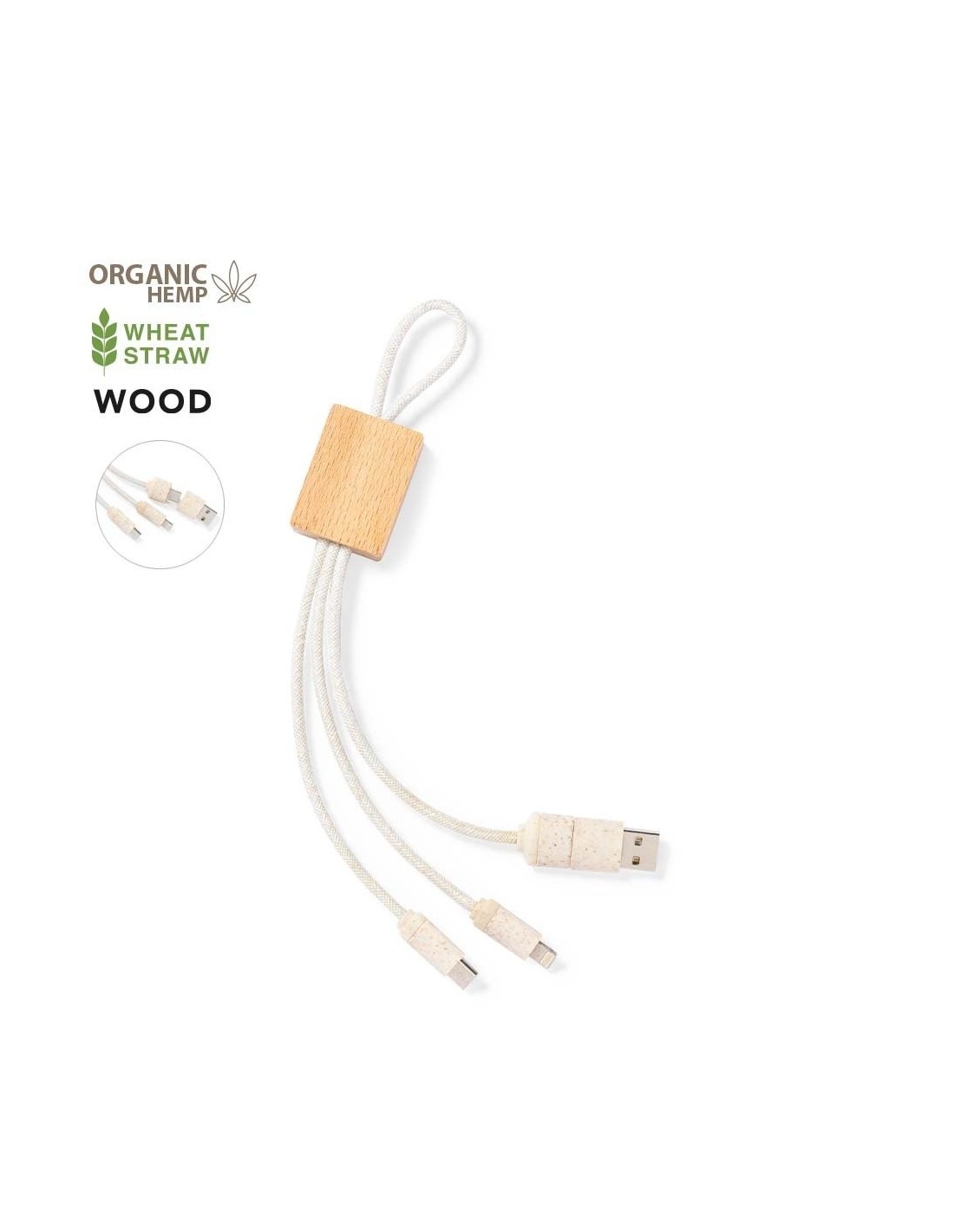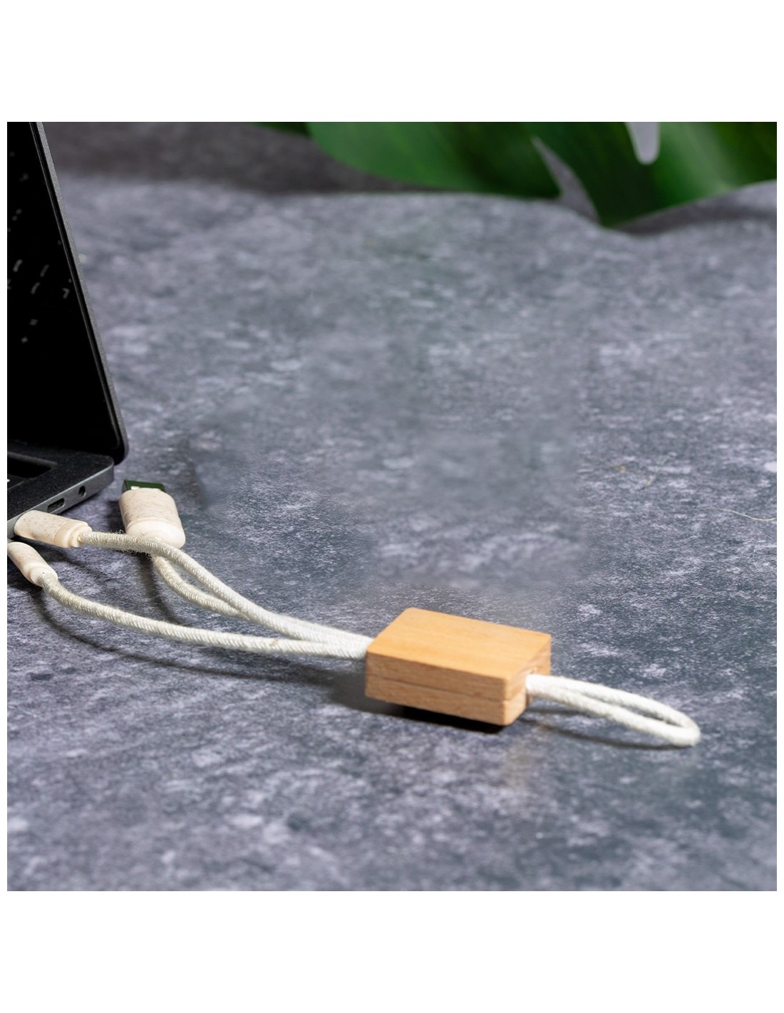 Cable cargador con cinta de transporte. Fabricado usando materiales naturales y respetuosos con el medio ambiente: Pieza central en madera natural. Cables recubiertos en cáñamo orgánico, obtenido de la planta cannabis, cuyos procesos tanto de cultivo como de obtención de fibras, son respetuosos con el medio ambiente, dando como resultado un material de gran resistencia, de origen natural y sostenible. Fundas de conectores en caña de trigo, para así fomentar la utilización de materias primas naturales y reducir las emisiones contaminantes. Incluye conexiones de entrada Tipo C y USB, salidas Lightning, Micro USB y Tipo C. 5V DC 2.4A. Presentado en bolsa individual de diseño kraft.