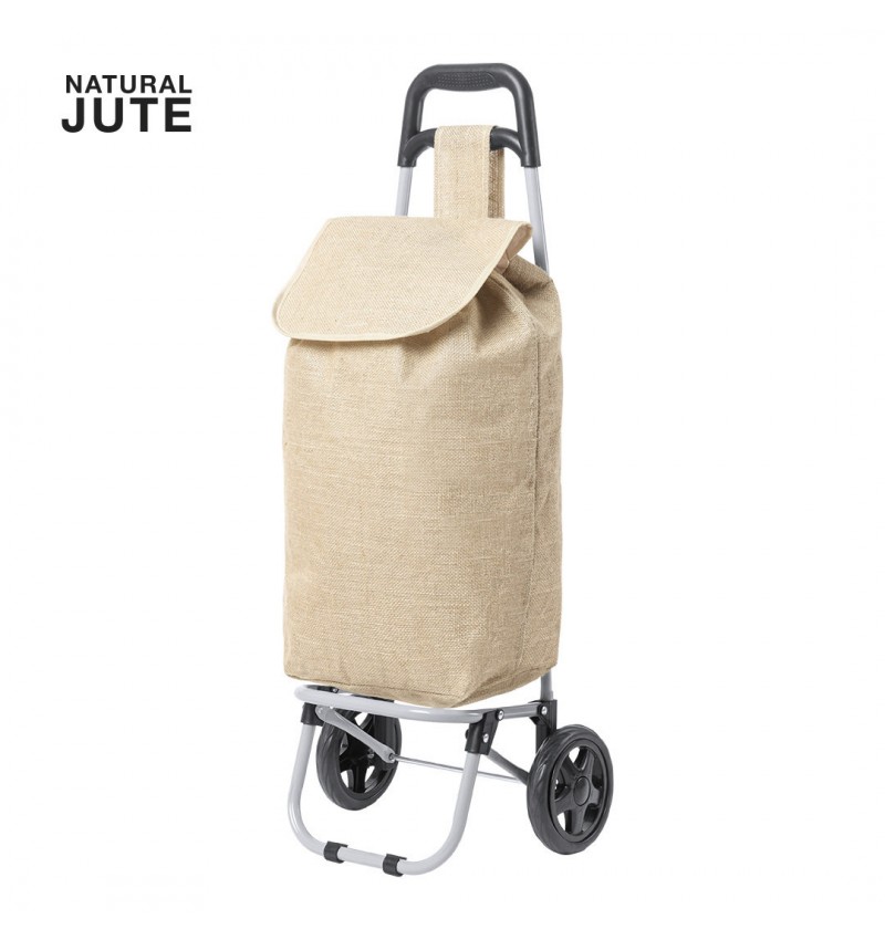 Carro de compra plegable y línea nature. Fabricado en resistente yute, fomentando la utilización de materiales naturales y así ayudar a la sostenibilidad del planeta. Con asa reforzada, cuerpo metálico tubular, bolsillo de cremallera posterior y soportes con gomas de protección. Ruedas reforzadas de alta calidad.