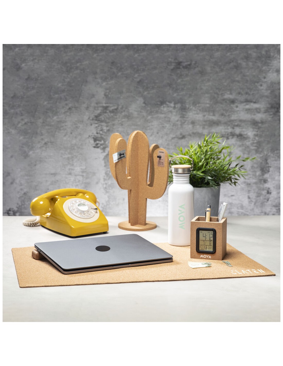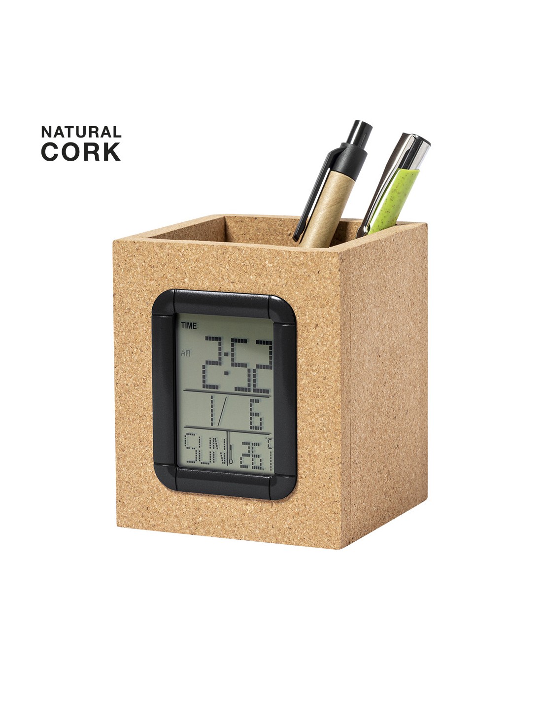 Lapicero de línea nature con reloj multifunción integrado. Fabricado en corcho natural, con funciones termómetro, calendario y alarma. Alimentación a pilas (de botón incluidas) y presentado en atractiva caja de diseño eco.