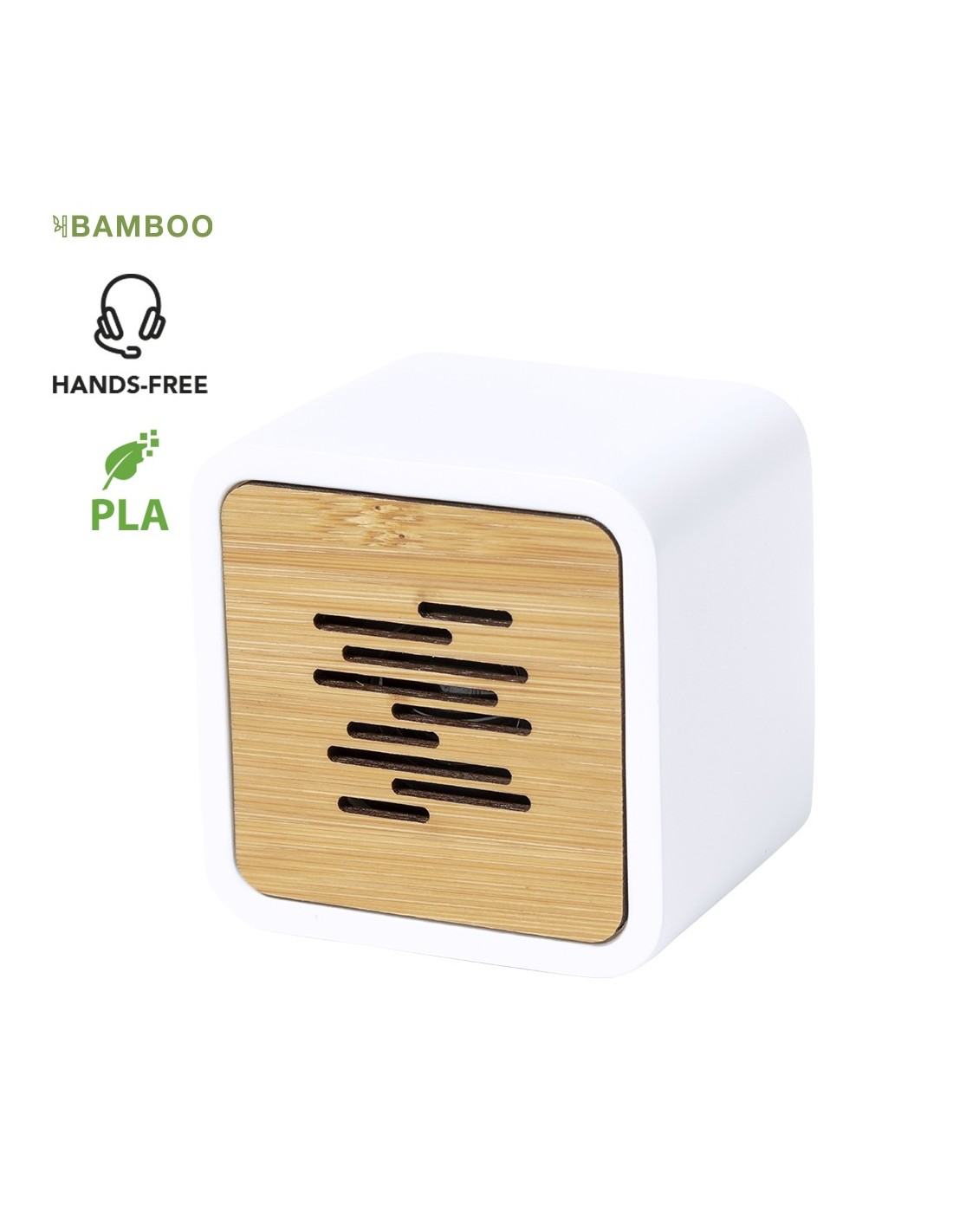 Altavoz de línea nature y conexión Bluetooth® 5.0. Fabricado en combinación de bambú y PLA -Ácido PoliLáctico-, que se obtiene a partir de recursos 100% naturales como el almidón de maíz, la yuca o la caña de azúcar, pudiendo convertirse en 100% compostable al final de su ciclo de vida útil. 3W de potencia, con función manos libres y recargable mediante cable USB -incluido-. Presentado en atractiva caja de diseño eco. Distintivo PLA sobre el artículo.