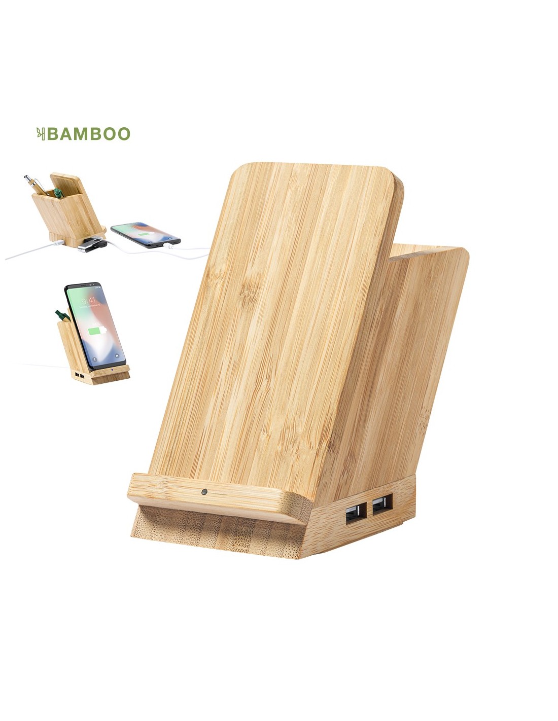 Lapicero multifunción 4 en 1 de línea nature fabricado en bambú. Con funciones lapicero, soporte para smartphone, cargador inalámbrico 5W y puerto USB (4xUSB 2.0). Compatible con smartphones con tecnología de carga inalámbrica. Incluye cable micro USB en color blanco de 1 metro de largo. Presentado en atractiva caja de diseño eco. Disponible manual de instrucciones en español e inglés.
