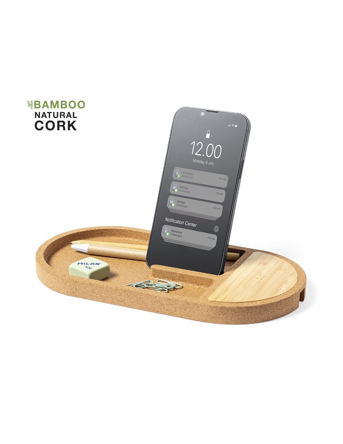 Cargador organizador inalámbrico 10W. Con base fabricada en en corcho natural y superficie de carga en bambú. Soporte para smartphone integrado y espacio de almacenaje para artículos de escritorio. Compatible con dispositivos equipados con tecnología de carga inalámbrica Qi, con indicador LED de estado de carga y cable de carga Tipo C incluido. Base antideslizante y presentado en caja individual de diseño kraft, con manual de instrucciones en español e inglés. Fabricado conforme a los estándares RoHS y en cumplimiento con los siguientes requisitos de seguridad: Sistema de protección contra sobrecalentamiento. Sistema de protección contra sobrecarga. Sistema de bloqueo para evitar cortocircuitos.