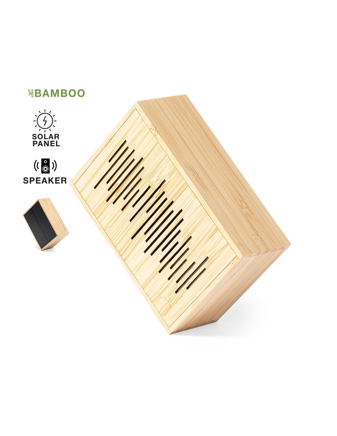 Altavoz solar de línea nature, fabricado en bambú procedente de bosques sostenibles con certificación FSC. Recargable mediante paneles solares integrados o por cable USB. Conexión Bluetooth®, con 3W de potencia. Presentado en caja individual de diseño eco en cartón kraft.