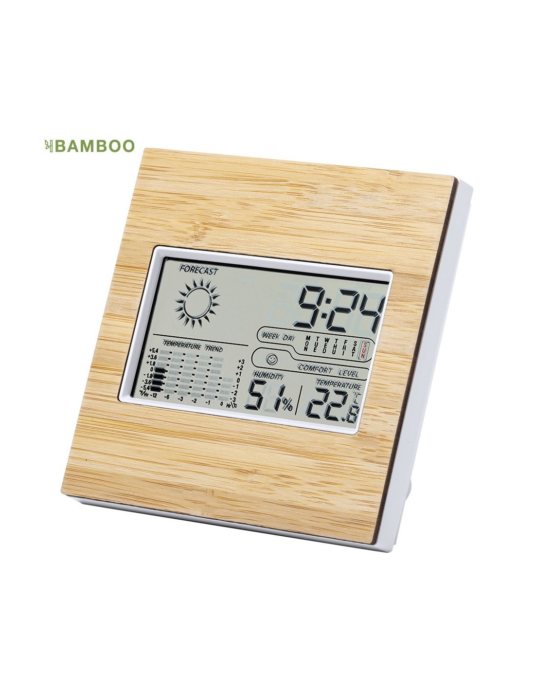 Estación meteorológica de línea nature con frontal en bambú. Con sensor de temperatura y humedad. Función calendario y alarma. Soporte trasero abatible y ajustable, con posibilidad de instalación en la pared. Alimentación a pilas (2xAAA no incluidas) y presentado en atractiva caja de diseño eco. Disponible manual de instrucciones en español e inglés.