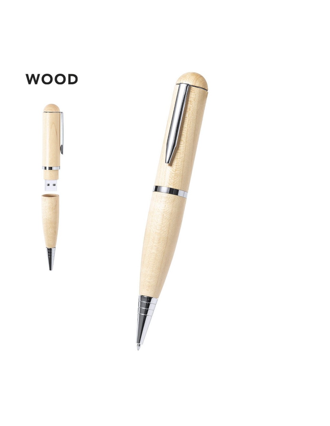 Bolígrafo USB de línea nature. Con memoria USB de 16GB de capacidad integrada en la capucha y fabricado en madera, para así fomentar la utilización de materiales naturales. De mecanismo giratorio y con tinta azul. Presentado en atractiva caja de acabado kraft.