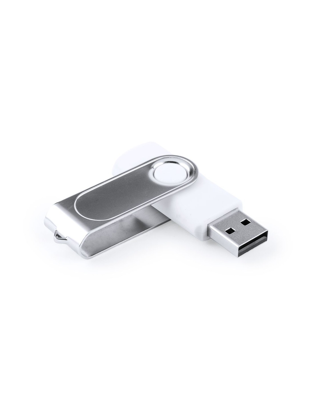 Memoria USB de 16GB de capacidad, mecanismo giratorio y en elegante acabado de color blanco. Con cuerpo troquelado, especialmente diseñado para marcaje en doming/gota de resina. Presentada en estuche individual con ventana.