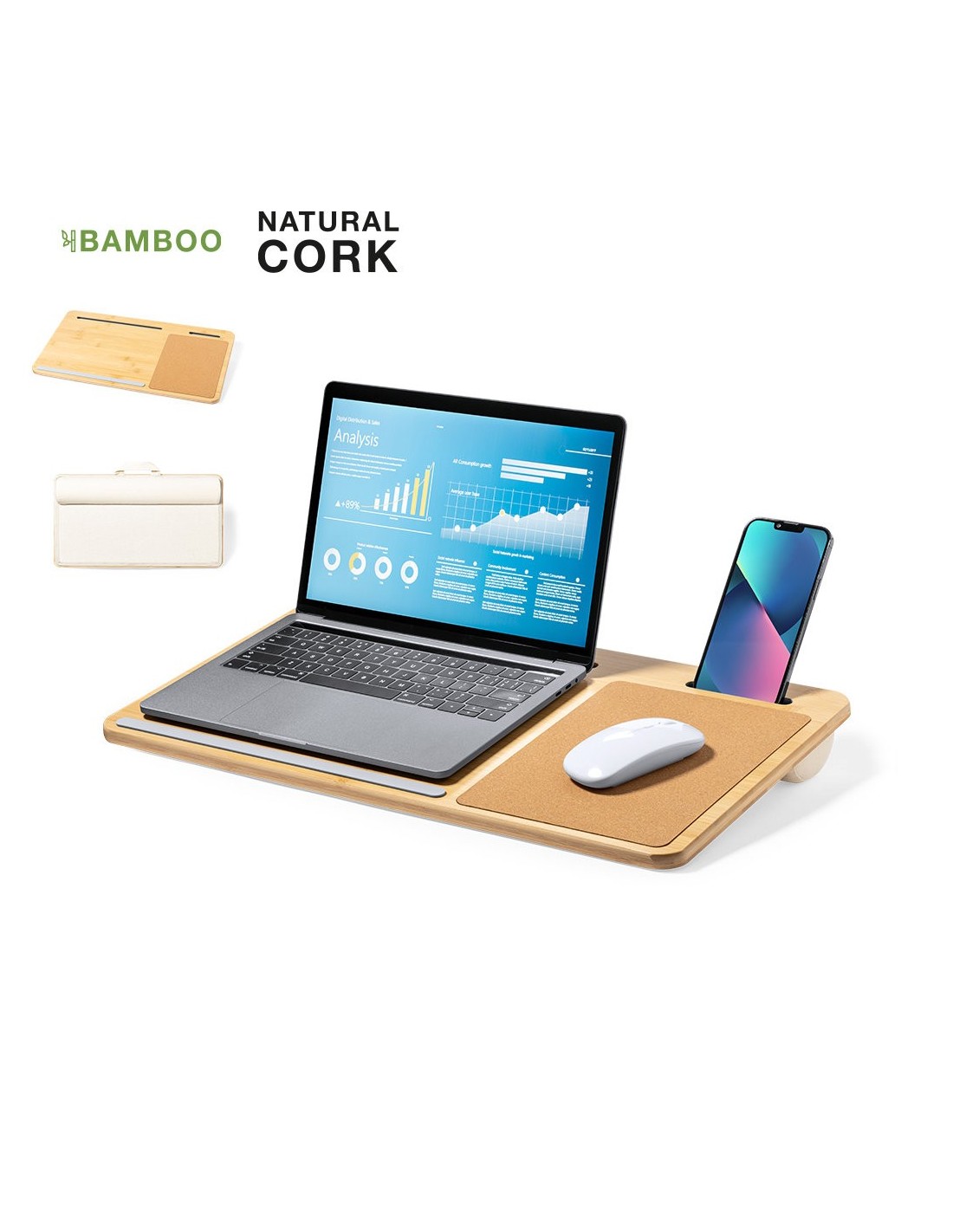 Alfombrilla organizador multifuncional de línea nature. Está fabricada en bambú y corcho natural, ayudando a la sostenibilidad del planeta. Incluye soportes para ordenador portátil, tablets y demás dispositivos móviles. Con alfombrilla para ratón integrada y de suave tacto. Además, incorpora acolchado para las rodillas, facilitando su uso durante largos periodos de manera confortable. Incluye práctica asa de transporte.