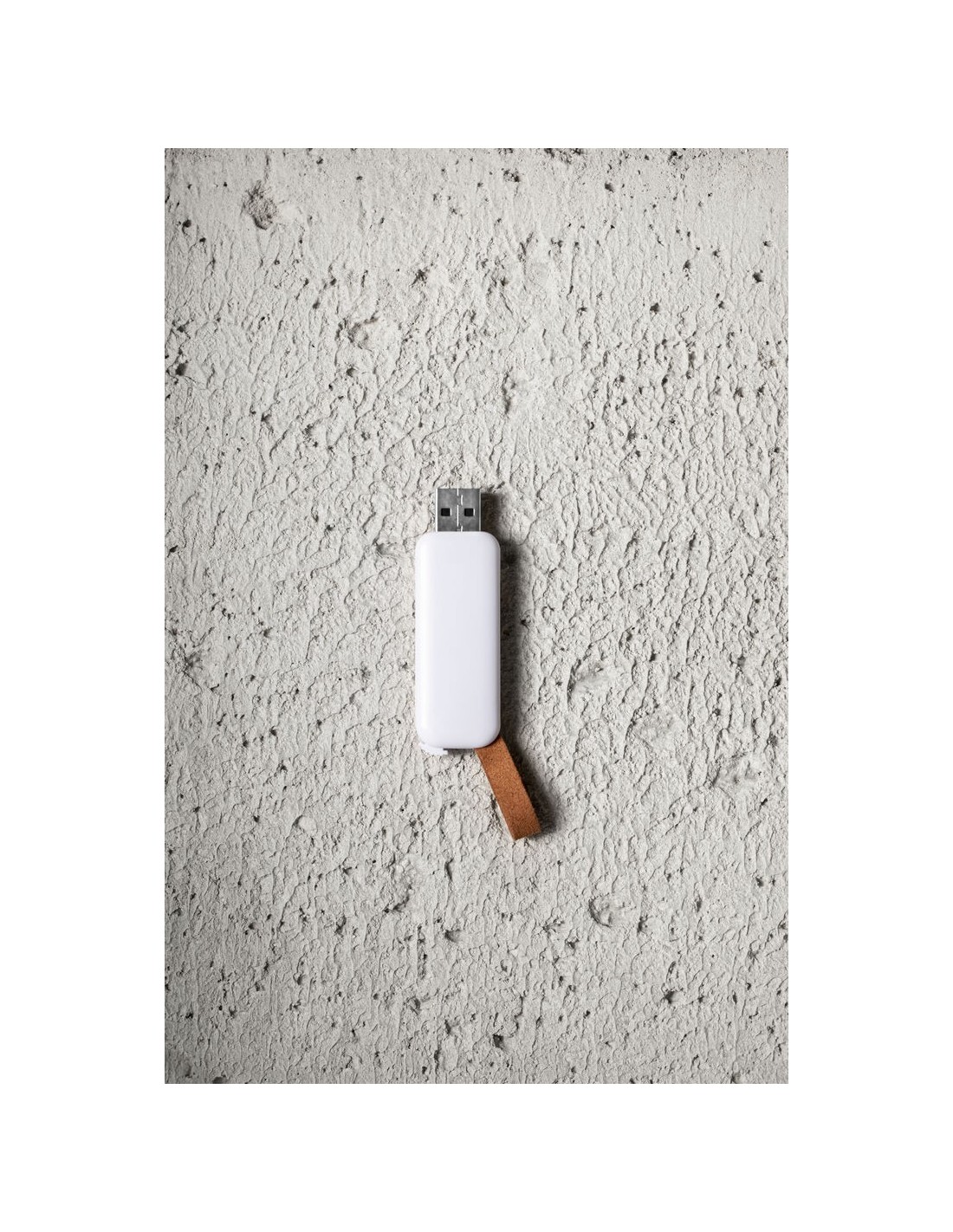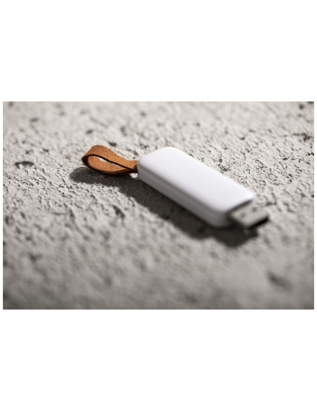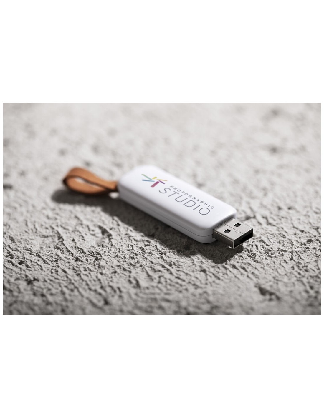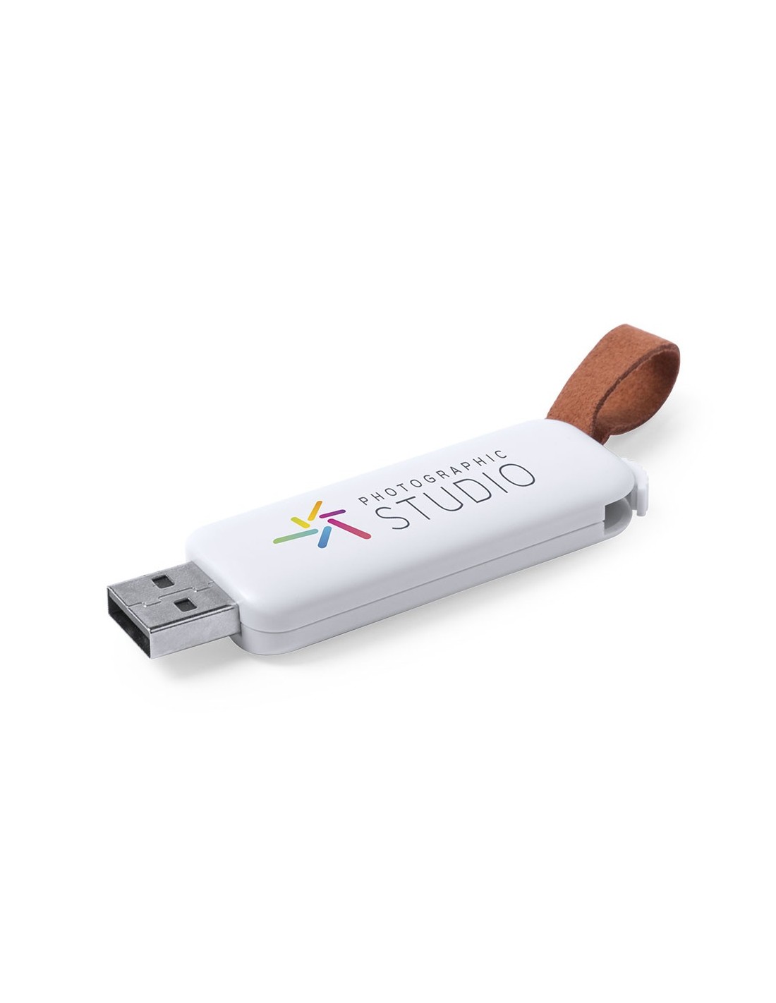 Memoria USB de 16GB de capacidad con diseño minimalista en color blanco. Especialmente diseñada para impresión digital, con mecanismo retráctil y cinta de piel. Presentada en estuche individual.