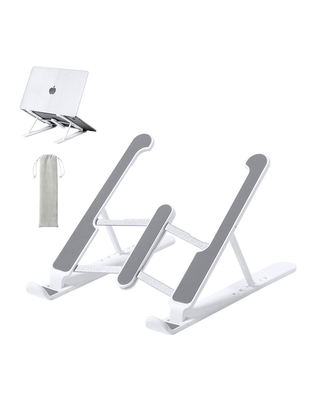 Soporte plegable para portátil. Fabricado en resistente ABS con protecciones antideslizantes en TPR para un firme ajuste al dispositivo. Regulable en altura, con plegado de tamaño compacto y presentado en funda de antelina con cierre de cordón y en caja individual de diseño.