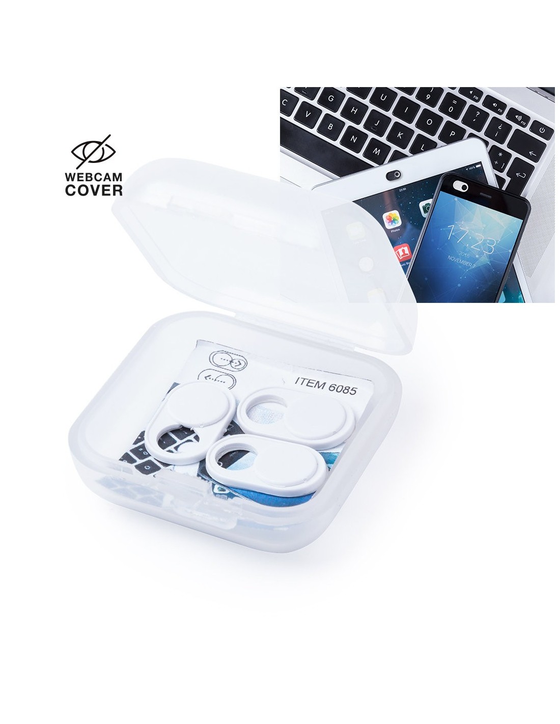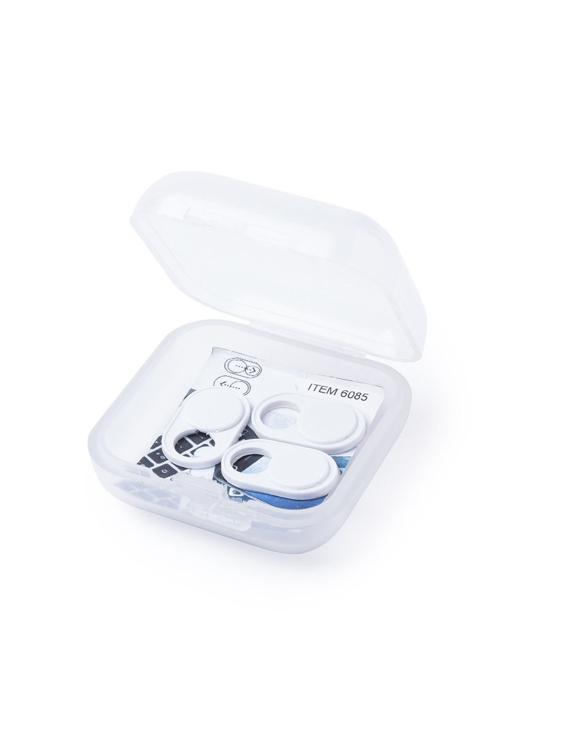 Tapa para cámara de dispositivo móvil para proteger la privacidad. En tamaño ultra compacto y servida en estuche individual de achado translúcido con 3 piezas. Disponible en colores blanco y negro, set presentado en bolsita individual con cartulina de diseño.