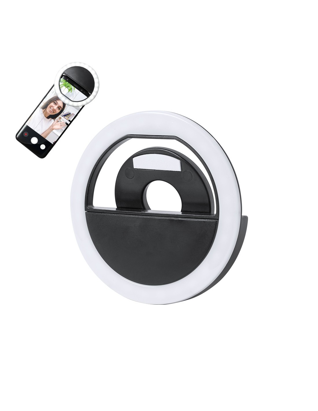 Anillo de luz led con acople para smartphone, fabricado en resistente ABS. 28 ledes, con 3 niveles de intensidad y recargable por USB (cable Micro USB incluido). Presentado en atractiva caja de diseño. Disponible manual en español e inglés.