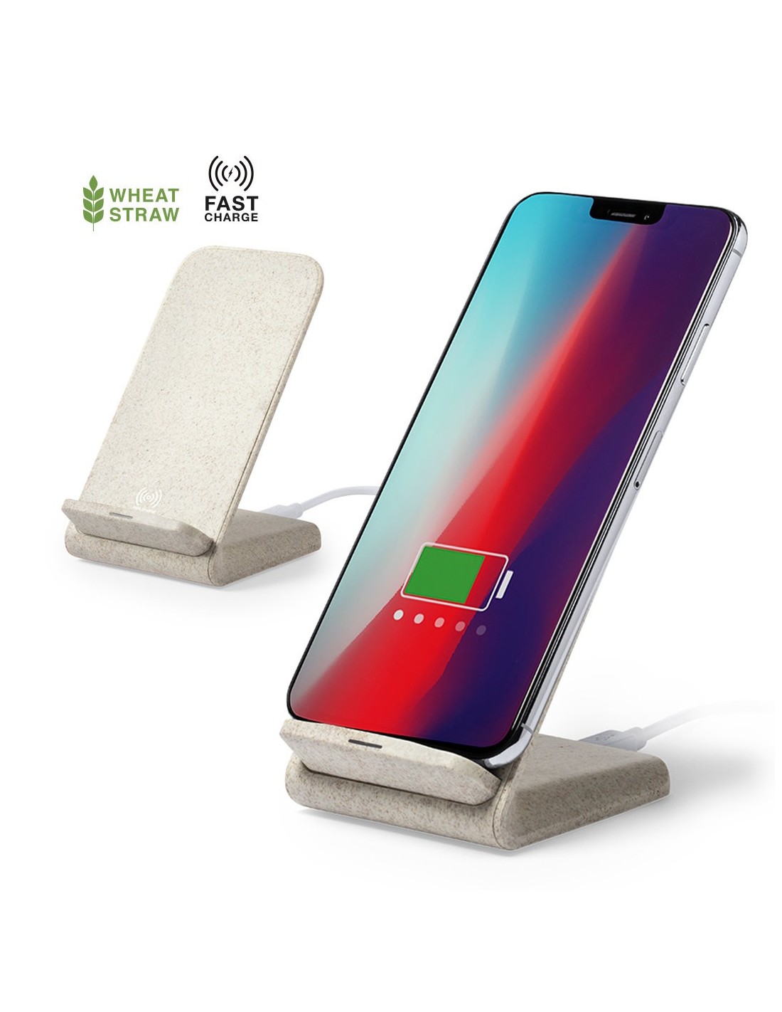 Cargador inalámbrico de línea nature con función soporte para móvil. Carcasa en caña de trigo, para así fomentar la utilización de materias primas naturales y reducir las emisiones contaminantes. Con función carga rápida de 10W y compatible con dispositivos equipados con tecnología de carga inalámbrica. Con luz indicadora de estado de carga y cable de 100 cm. Amplia superficie de marcaje, presentado en atractiva caja de diseño eco.