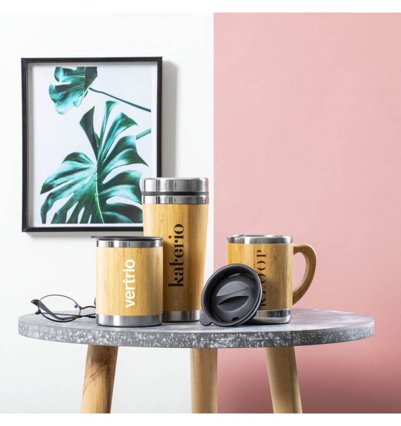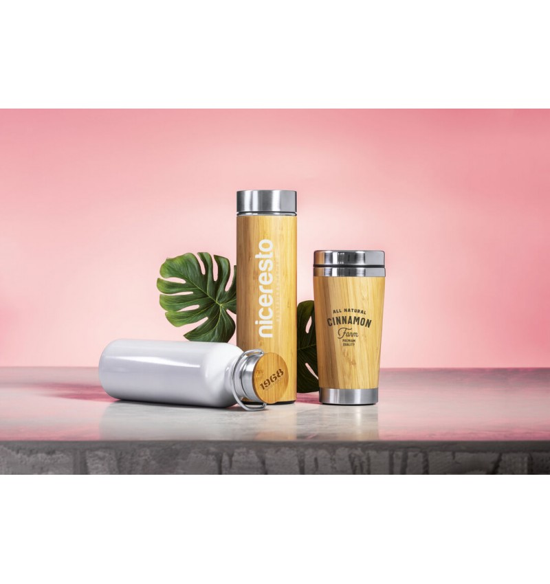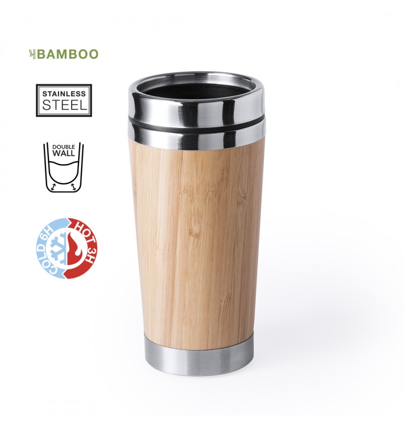 Vaso en línea nature con interior en acero inox y parte exterior en madera de bambú. 500ml de capacidad, con tapa dosificador de seguridad y presentado en una atractiva caja de diseño.