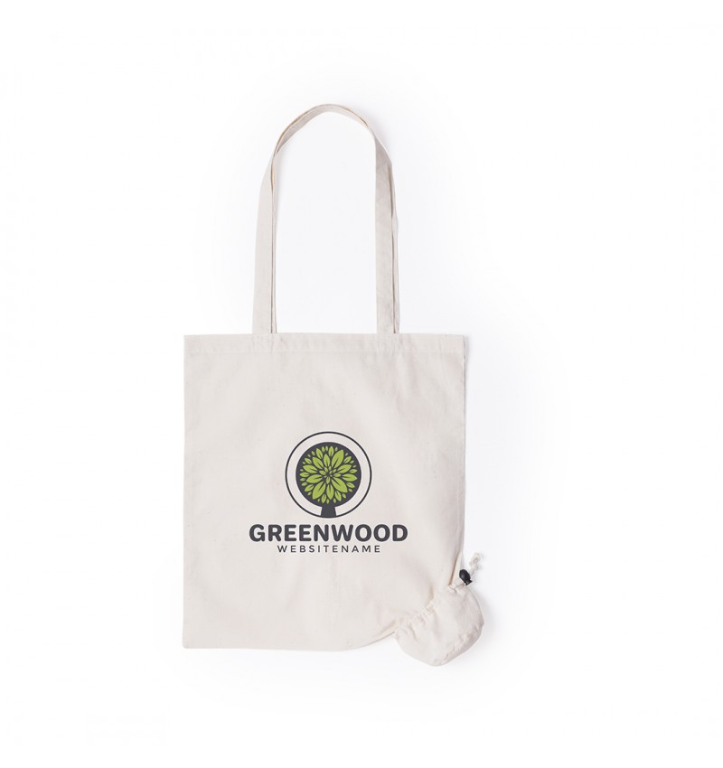 Bolsa plegable ecológica en resistente algodón de 105g/m2 en color blanco natural. Con cómodas asas largas de 2,5x70cm y cordón a juego. Accesorio de ajuste para fácil plegado.