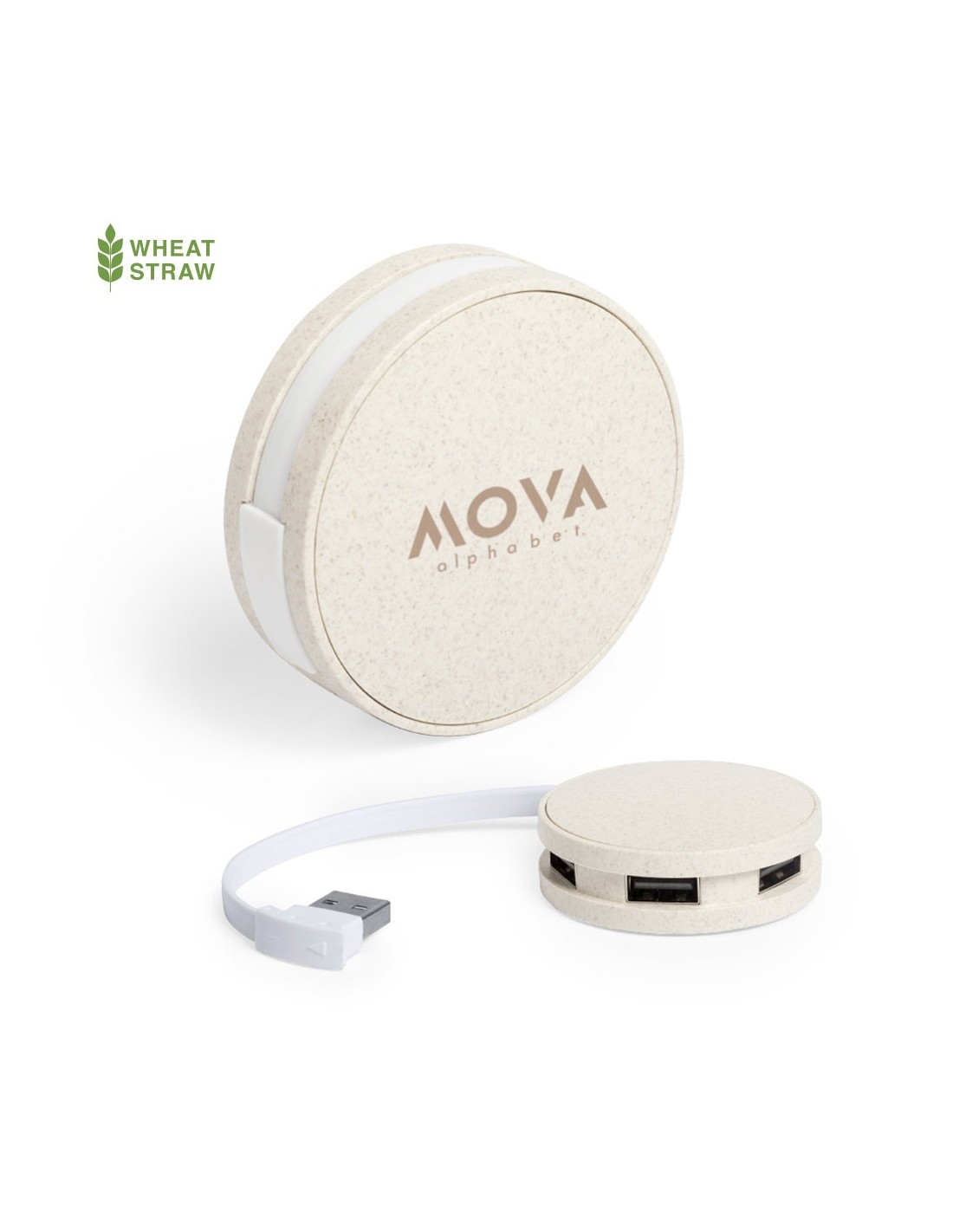 Original y compacto puerto USB de forma redondeada de línea nature. Carcasa en caña de trigo, para así fomentar la utilización de materias primas naturales y reducir las emisiones contaminantes. Con 4 puertos USB 2.0 para conectar multitud de dispositivos y amplia superficie de marcaje. Presentado en caja individual de diseño eco.