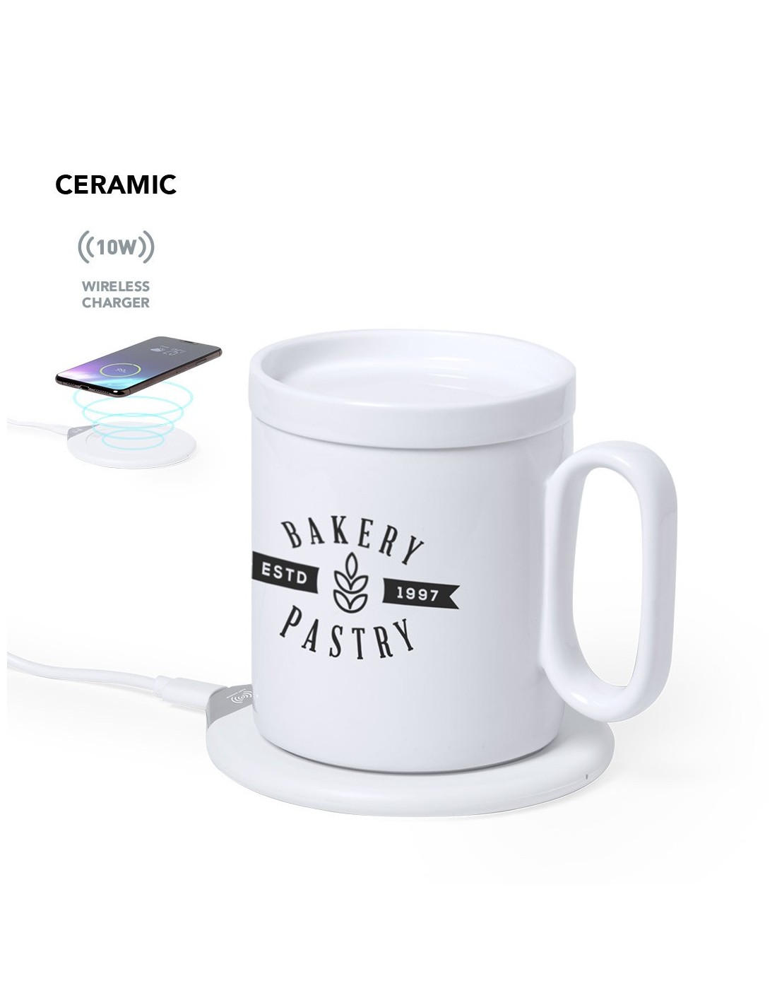 Calentador de tazas con cargador inalámbrico integrado de carga rápida -10W-. Con taza de cerámica de 350 ml, especialmente diseñada para calentar y mantener la temperatura de la bebida, con tapa a juego. Incluye cargador de pared y cable de carga Tipo C. Set presentado en atractiva caja de diseño.