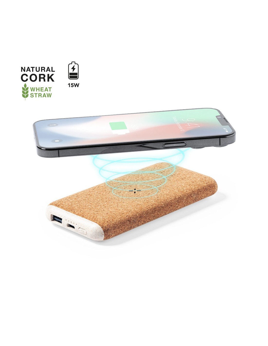 Batería auxiliar externa de línea nature, fabricada en combinación de corcho natural y caña de trigo. De 8.000 mAh de capacidad de carga-. Con cargador inalámbrico integrado 15W, con conector de entrada/salida Tipo C + salida USB. Presentada en caja individual de diseño eco en cartón kraft.Las capacidades mostradas en todas nuestras baterías auxiliares externas son reales, incorporando todas ellas baterías de grado A y no recicladas, con una vida útil de al menos 500 ciclos de carga y según normativa CE. Además, están fabricadas conforme a los estándares RoHS y en cumplimiento con los siguientes requisitos de seguridad: Sistema de protección contra sobrecarga del power bank. Sistema de protección contra descarga completa que proporciona una mayor durabilidad del power bank. Sistema de bloqueo para evitar cortocircuitos. Sistema de transferencia de carga constante, acorde con la capacidad del dispositivo de destino.