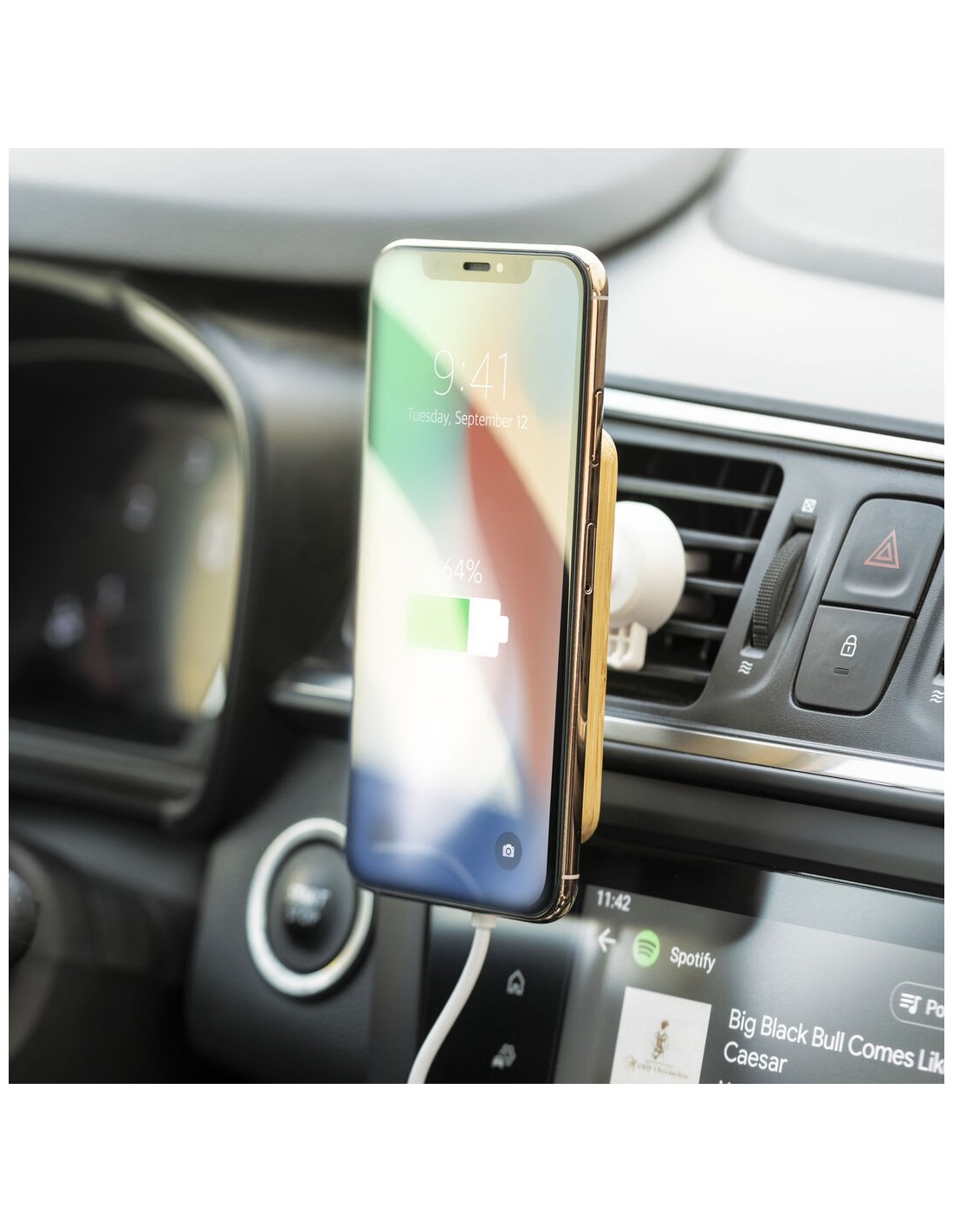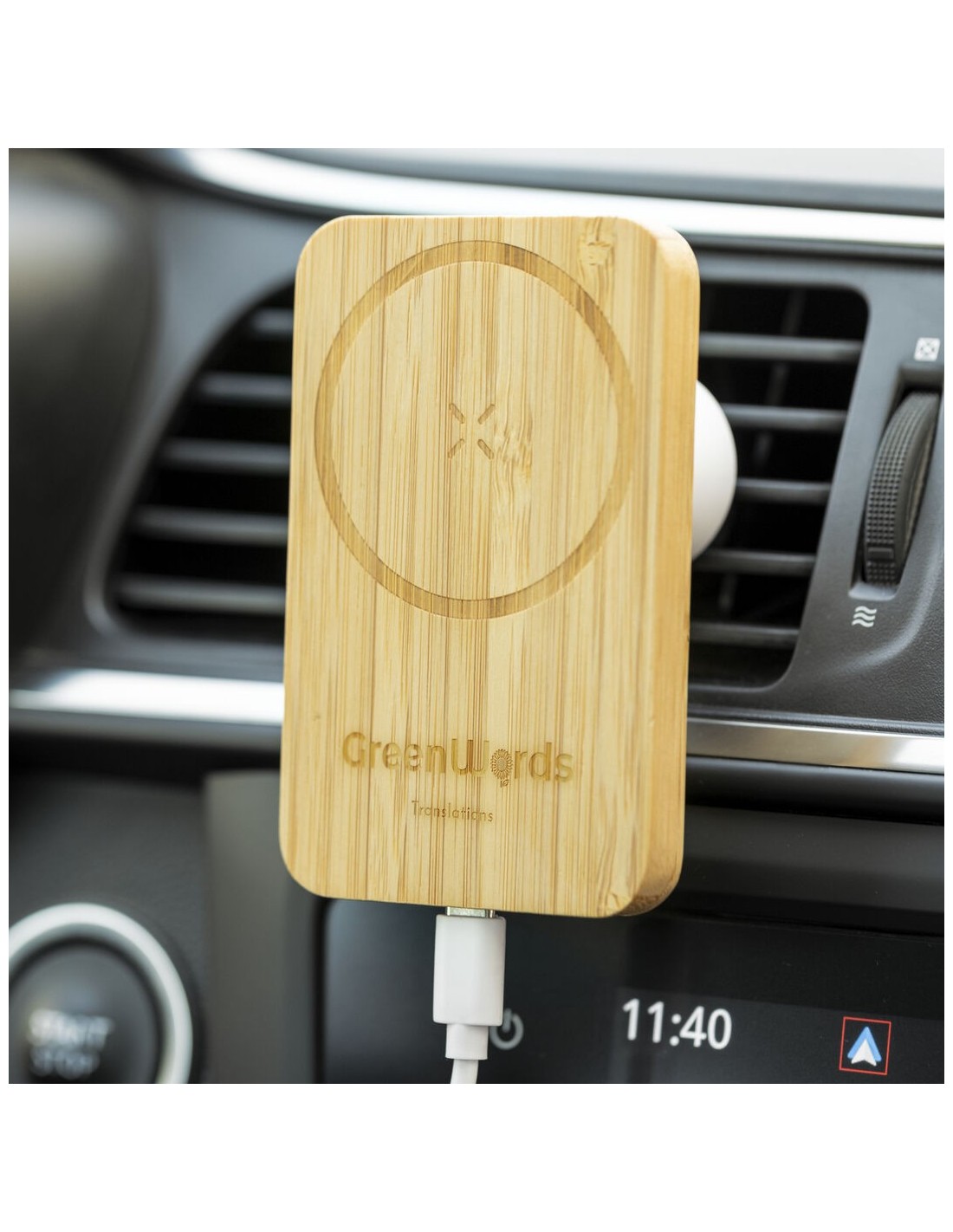 Soporte de rejilla de coche para smartphone de línea nature y fabricado en bambú. Con cargador inalámbrico 15W integrado y fijación magnética para poder usar el dispositivo mientras se está cargando. Incluye anillo adhesivo, siendo válido para todos los dispositivos con tecnología Magsafe y Qi. Presentado en caja individual de diseño eco en cartón kraft.