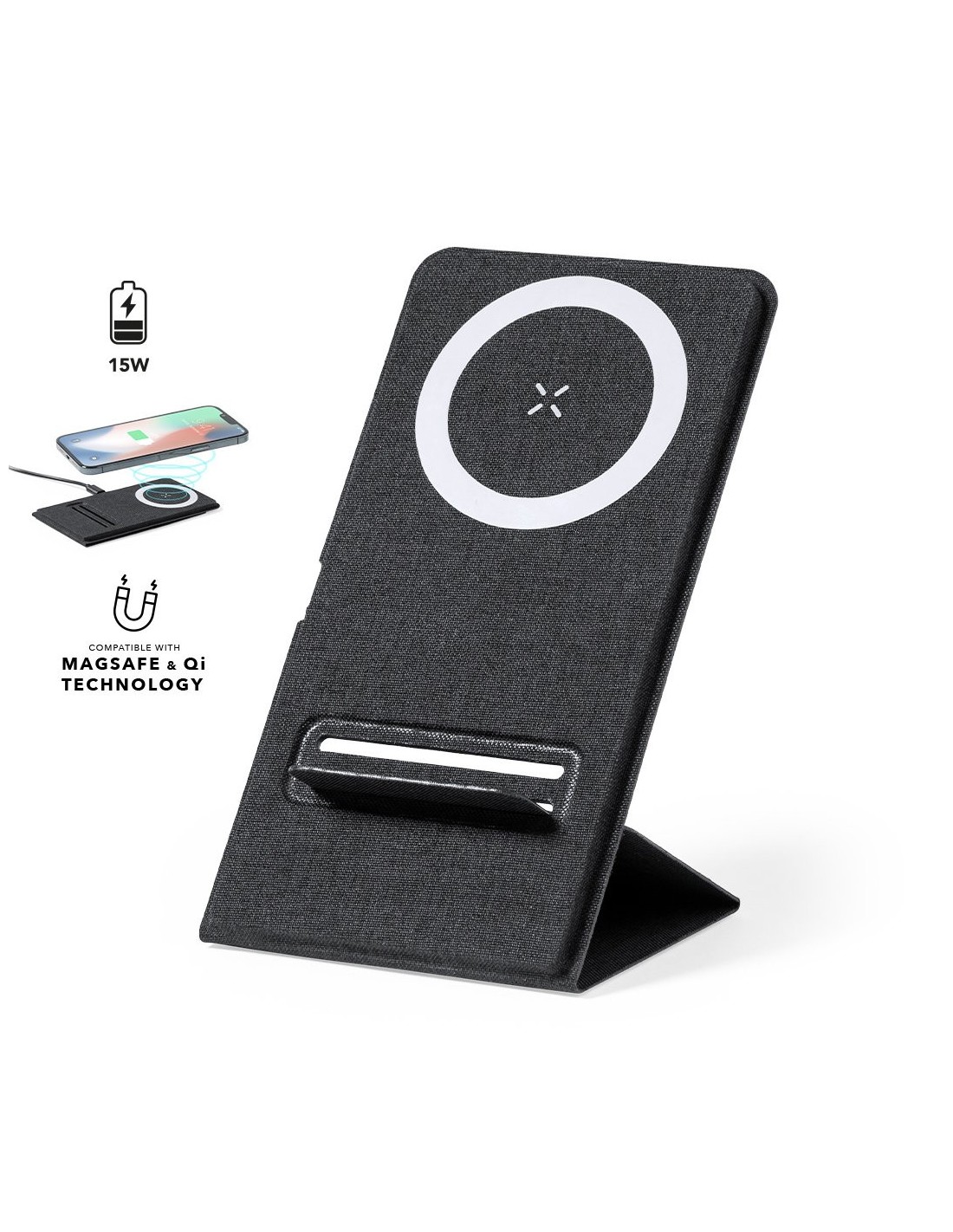 Cargador inalámbrico 15W. Fabricado en resistente poliéster 300D y con fijación magnética para poder usar el dispositivo mientras se produce la carga del mismo e incluyendo anillo adhesivo. Válido para todos los dispositivos con tecnología Magsafe y Qi. Plegado de pequeño tamaño para fácil transporte y presentado en atractiva caja individual de diseño.