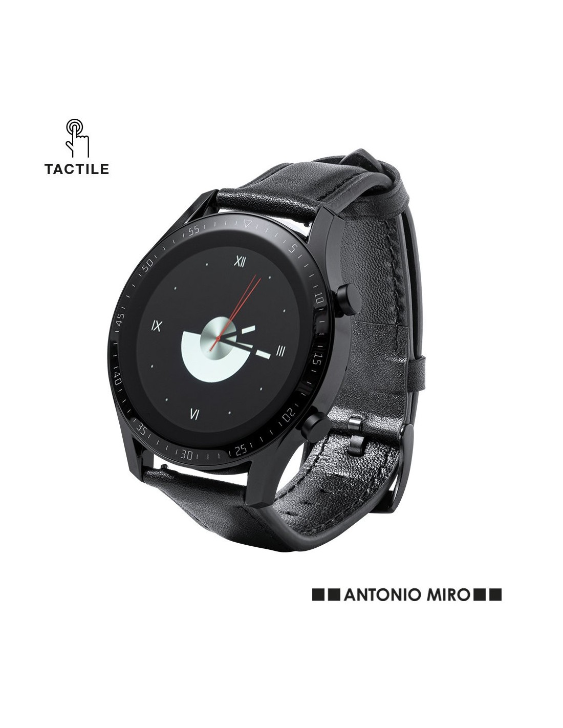 Reloj inteligente multifunción de Antonio Miró, con elegante y moderno diseño de calidad premium y estilo atemporal. Correa en piel y pantalla TFT de 1,32 pulgadas, con conexión Bluetooth y múltiples funciones integradas, que lo convierten en el accesorio perfecto para el día a día.Resistente a salpicaduras de agua, con APP disponible para iOS y Android. Incluye manual de instrucciones en Español e Inglés.Presentado en atractiva caja de diseño premium en color negro con logotipo de la marca.