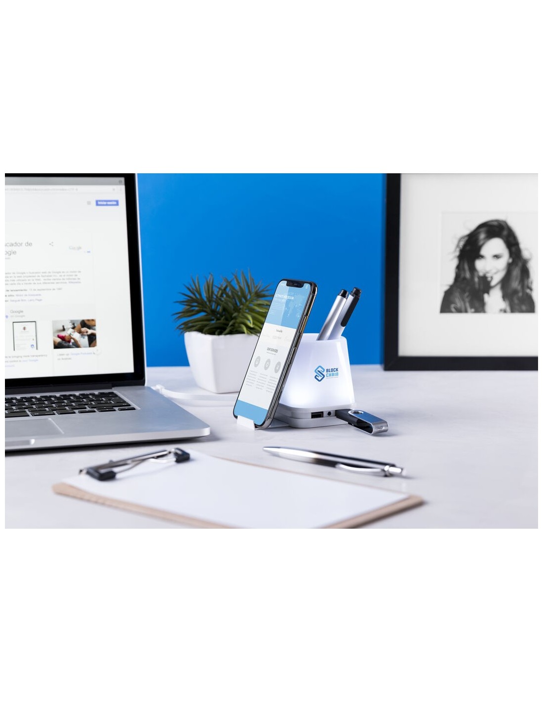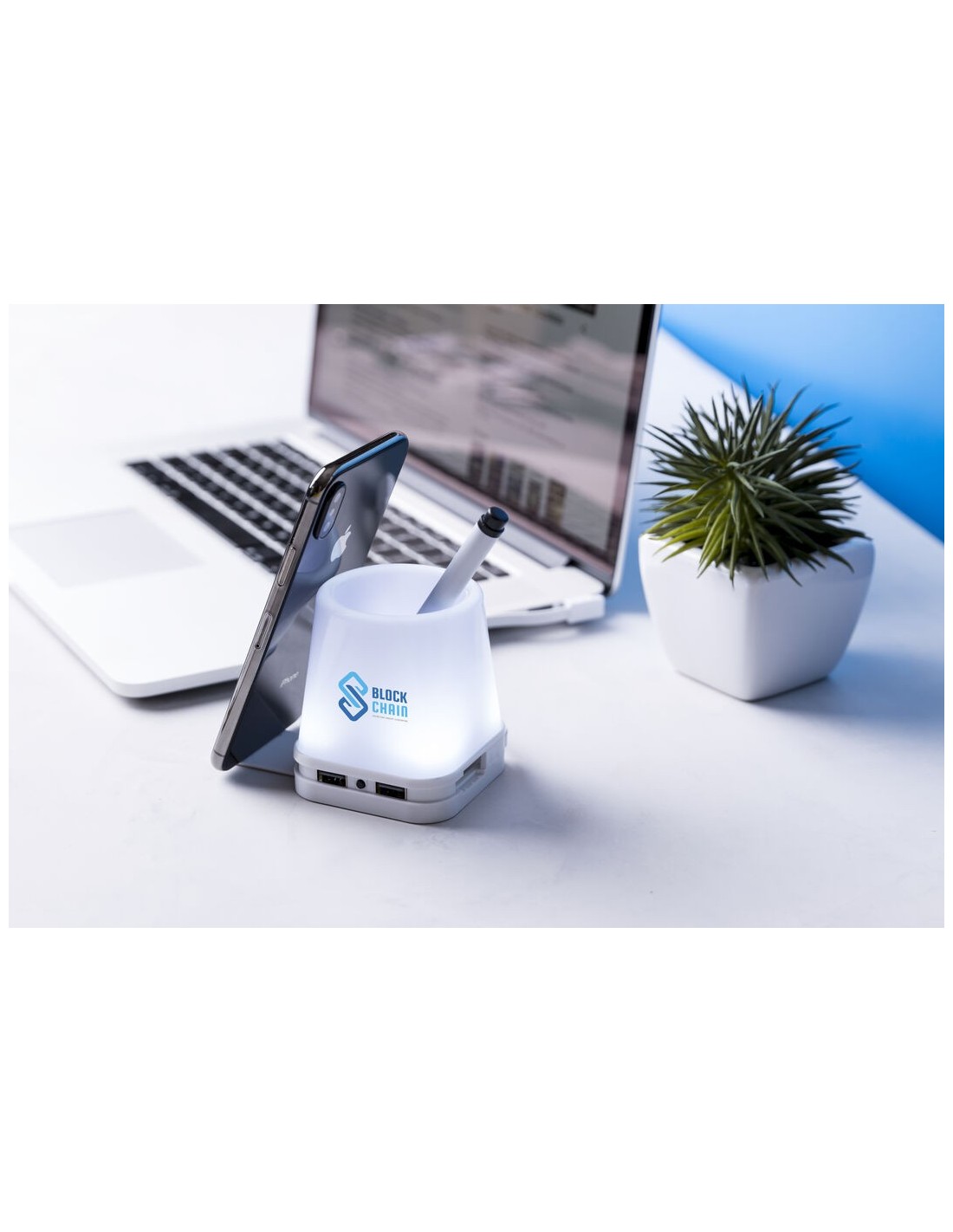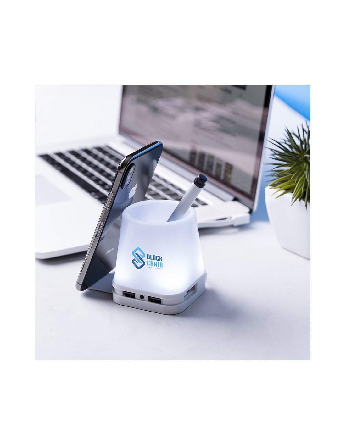 Original lapicero con puerto USB integrado. Retroiluminado por luz led, con 2 posiciones de iluminación y cuerpo en elegante color blanco para fácil marcaje. Incluye 4 puertos USB 2.0. Presentado en caja individual.