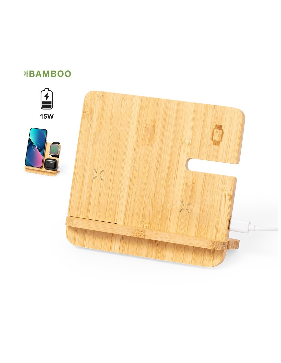 Completo multicargador inalámbrico 15W con soporte para gadgets, fabricado en bambú. Diseñado para la carga simultánea del smartphone, auriculares y smartwatch: una estación de carga todo en uno, versátil y con diferentes soportes. Presentado en caja de diseño kraft. Disponible manual de instrucciones en español e inglés..Materiales como el bambú fomentan la utilización de materias primas naturales, reduciendo las emisiones contaminantes. Proviene de una planta de gran resistencia y versatilidad, con crecimiento y regeneración rápidos, siendo una excelente alternativa al uso de madera tradicional..Fabricado conforme a los estándares RoHS y en cumplimiento con los siguientes requisitos de seguridad:.Sistema de protección contra sobrecalentamiento..Sistema de protección contra sobrecarga..Sistema de bloqueo para evitar cortocircuitos..