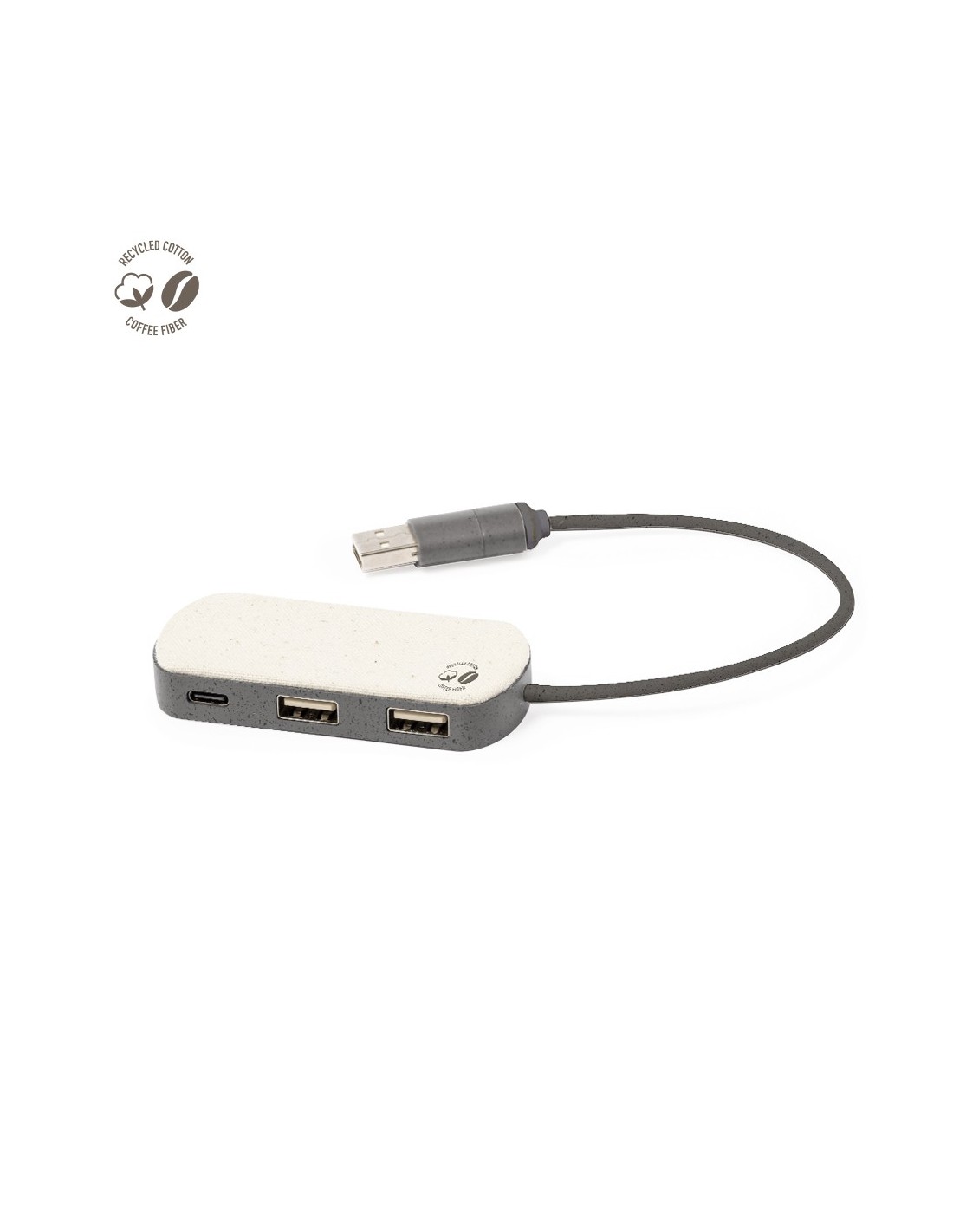 Puerto USB 2.0 fabricado en fibra de café. Con conexión dual USB/Tipo C y 3 puertos: uno con conexión Tipo C y 2 puertos USB. Con logotipo fibra de café y una amplia superficie de marcaje. Presentado en caja individual de diseño kraft..La fibra de café es una solución circular que se obtiene de la utilización de los residuos producidos en la obtención del café. Una alternativa sostenible que favorece la reducción del uso de plásticos, ahorrando energía en su proceso de fabricación y contribuyendo al cuidado del medio ambiente.