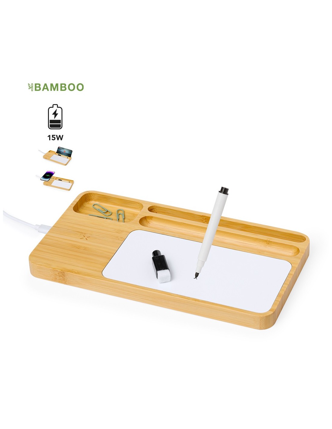 Cargador organizador inalámbrico 15W de línea nature. Con función soporte para smartphone y compartimento extra para objetos. Pizarra para notas integrada y rotulador en tinta negra con borrador en la capucha. Amplia superficie de marcaje y presentado en caja individual de diseño eco en cartón kraft. Disponible manual de instrucciones en español e inglés..Materiales como el bambú fomentan la utilización de materias primas naturales, reduciendo las emisiones contaminantes. Proviene de una planta de gran resistencia y versatilidad, con crecimiento y regeneración rápidos, siendo una excelente alternativa al uso de madera tradicional..Fabricado conforme a los estándares RoHS y en cumplimiento con los siguientes requisitos de seguridad: Sistema de protección contra sobrecalentamiento. Sistema de protección contra sobrecarga. Sistema de bloqueo para evitar cortocircuitos.