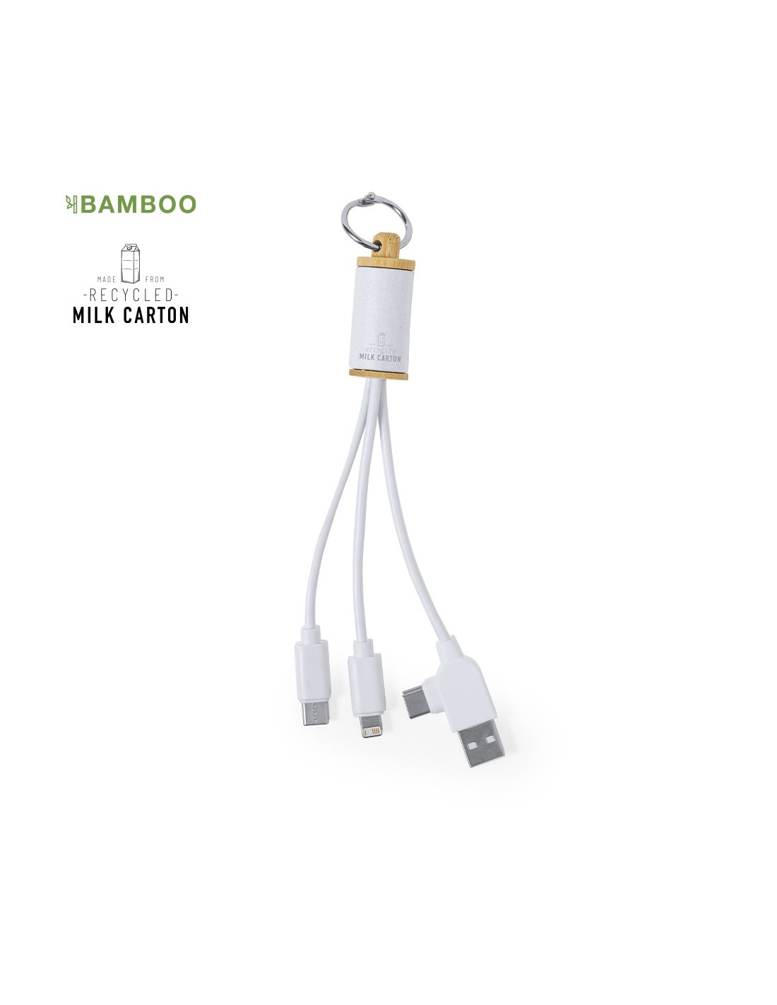 Cable cargador fabricado en combinación de bambú y material reciclado a partir de cartones de leche. Incluye conexión dual USB/Tipo C + conexiones Micro USB, Tipo C y Lightning. Con original anilla de transporte y logotipo cartones de leche reciclados. Presentado en caja individual de diseño kraft, con papel protector incluido. 5V DC 2.4A..Los cartones de leche se componen en su mayor parte de cartón y aluminio. Durante su proceso de reciclado, se separan los distintos materiales del envase para su reutilización y nuevo uso, contribuyendo así a recorrer el camino infinito de la economía circular. Este material se caracteriza por su alto grado de reciclabilidad, así como por su ligereza y resistencia..Materiales como el bambú fomentan la utilización de materias primas naturales, reduciendo las emisiones contaminantes. Proviene de una planta de gran resistencia y versatilidad, con crecimiento y regeneración rápidos, siendo una excelente alternativa al uso de madera tradicional..Fabricado conforme a estándares RoHS, con sistema de bloqueo para evitar cortocircuitos.