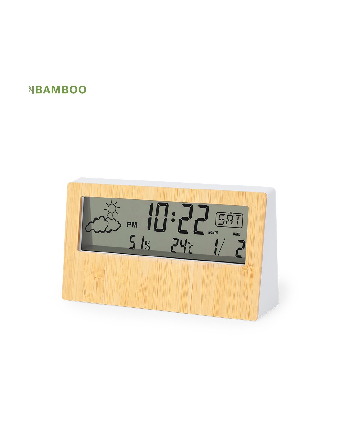 Estación meteorológica con frontal en bambú. Con sensor de temperatura y humedad. Función calendario y alarma. Alimentación a pila (1xAAA no incluida) y presentado en atractiva caja de diseño kraft. Disponible manual de instrucciones en español e inglés..Materiales como el bambú fomentan la utilización de materias primas naturales, reduciendo las emisiones contaminantes. Proviene de una planta de gran resistencia y versatilidad, con crecimiento y regeneración rápidos, siendo una excelente alternativa al uso de madera tradicional.