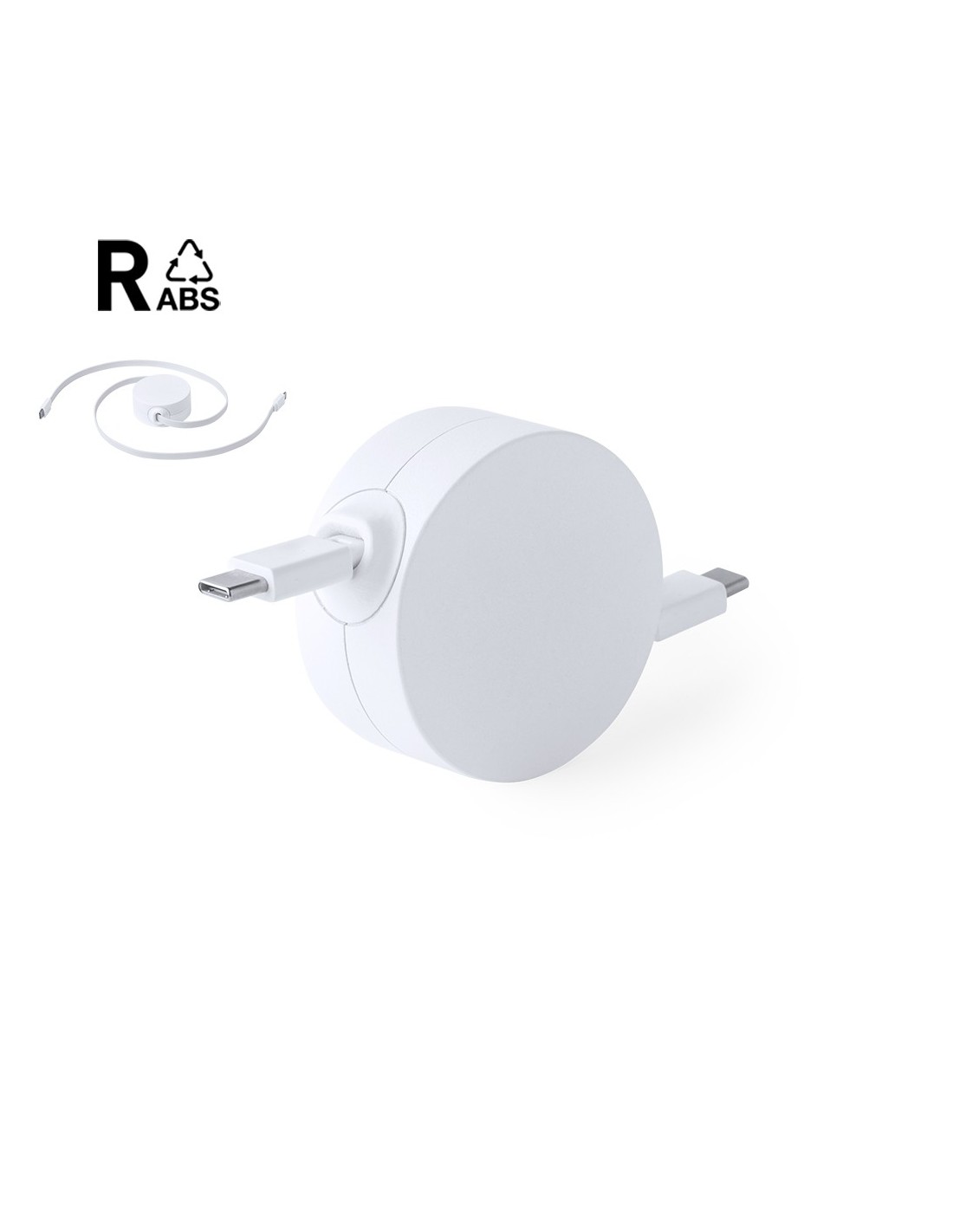 Cable cargador y sincronizador extensible, válido para cargar dispositivos y transferir datos. Fabricado en resistente RABS de color blanco. Pieza central con amplia zona de marcaje y mecanismo interior extensible. Incluidas conexiones de entrada y salida Tipo C. Presentado en bolsa individual de diseño kraft..El RABS es un plástico altamente reciclable de gran resistencia y con multitud de aplicaciones que lo convierten en una solución eco-friendly. Con certificación RCS, que garantiza el origen reciclado del mismo.