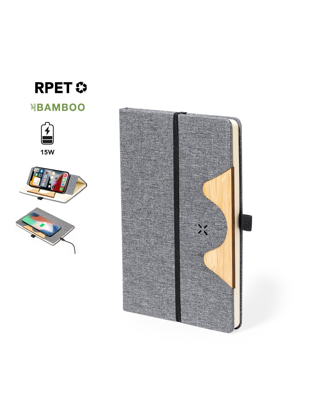 Bloc de notas cargador tamaño A5 y fabricado en resistente poliéster 300D RPET. Portada con detalle en bambú y cargador inalámbrico de 15W integrado, compatible con smartphones con tecnología de carga inalámbrica. Incluido cable de carga Tipo C y disponible manual de instrucciones en español e inglés. Con 80 hojas interiores de disposición a una raya y presentado en bolsa de papel reciclado. .El material RPET se elabora a partir de plástico reciclado, para así fomentar la reutilización de residuos plásticos y ayudar a la sostenibilidad del planeta..Materiales como el bambú fomentan la utilización de materias primas naturales, reduciendo las emisiones contaminantes. Proviene de una planta de gran resistencia y versatilidad, con crecimiento y regeneración rápidos, siendo una excelente alternativa al uso de madera tradicional..Fabricado conforme a los estándares RoHS y en cumplimiento con los siguientes requisitos de seguridad: Sistema de protección contra sobrecalentamiento. Sistema de protección contra sobrecarga. Sistema de bloqueo para evitar cortocircuitos.