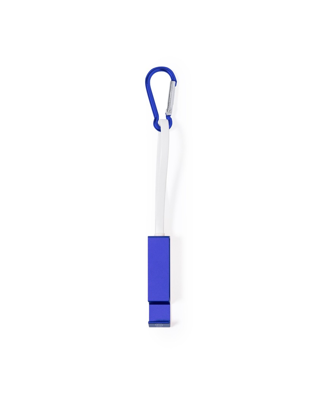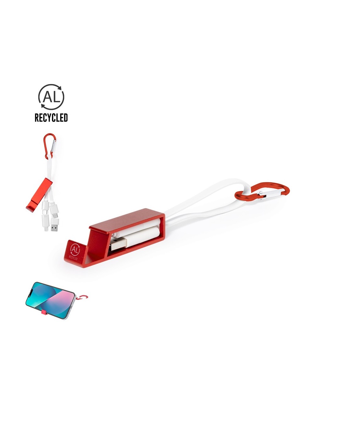 Cable cargador multifunción, fabricado en Aluminio Reciclado y con un ingenioso diseño que permite guardar los cables de carga cómodamente, además de facilitar el transporte. Incluye mosquetón a juego y soporte para smartphone, con conexión Tipo C (entrada y salida) y dual Micro USB / Lightning. En varios colores de acabado metalizado y con logotipo Aluminio Reciclado. Presentado en atractiva bolsa reciclada individual..El Aluminio Reciclado es un material con posibilidades de reciclaje casi infinitas, sin perder sus propiedades originales y consumiendo menos energía en este proceso..Certificación GRS (Global Recycled Standard / Estándar de Reciclaje Global), que garantiza el origen reciclado del material usado para fabricar el producto.