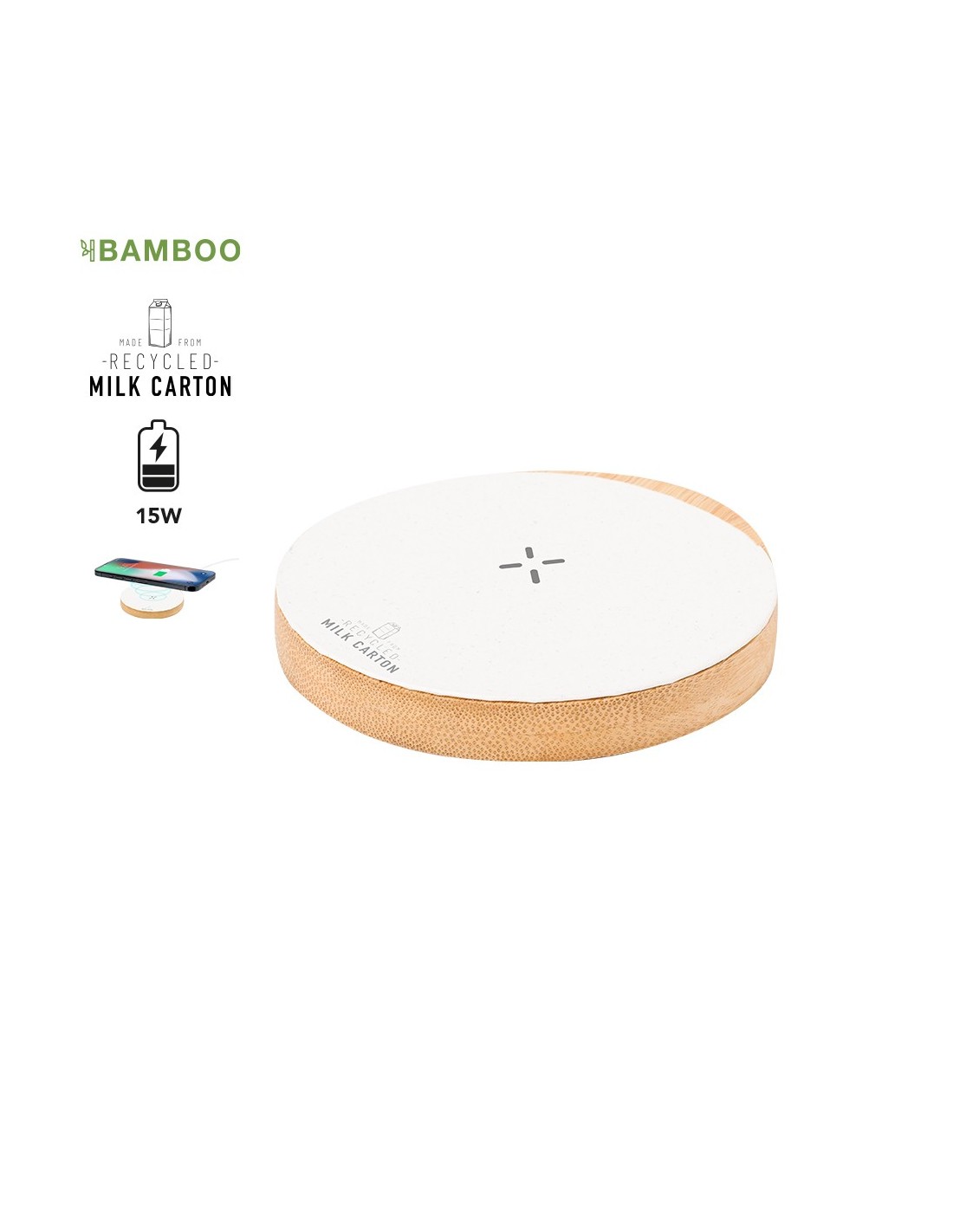 Cargador inalámbrico 15W de forma circular. Con superficie de carga en material reciclado a partir de cartones de leche y base fabricada en bambú, compatible con dispositivos equipados con tecnología de carga inalámbrica Qi. Cable cargador Tipo C incluido, con logotipo cartones de leche reciclados en base de carga. Base de bambú antideslizante y presentado en caja individual de diseño kraft. Con manual de instrucciones en español e inglés..Los cartones de leche se componen en su mayor parte de cartón y aluminio. Durante su proceso de reciclado, se separan los distintos materiales del envase para su reutilización y nuevo uso, contribuyendo así a recorrer el camino infinito de la economía circular. Este material se caracteriza por su alto grado de reciclabilidad, así como por su ligereza y resistencia..Materiales como el bambú fomentan la utilización de materias primas naturales, reduciendo las emisiones contaminantes. Proviene de una planta de gran resistencia y versatilidad, con crecimiento y regeneración rápidos, siendo una excelente alternativa al uso de madera tradicional..Fabricado conforme a los estándares RoHS y en cumplimiento con los siguientes requisitos de seguridad:.Sistema de protección contra sobrecalentamiento..Sistema de protección contra sobrecarga..Sistema de bloqueo para evitar cortocircuitos..