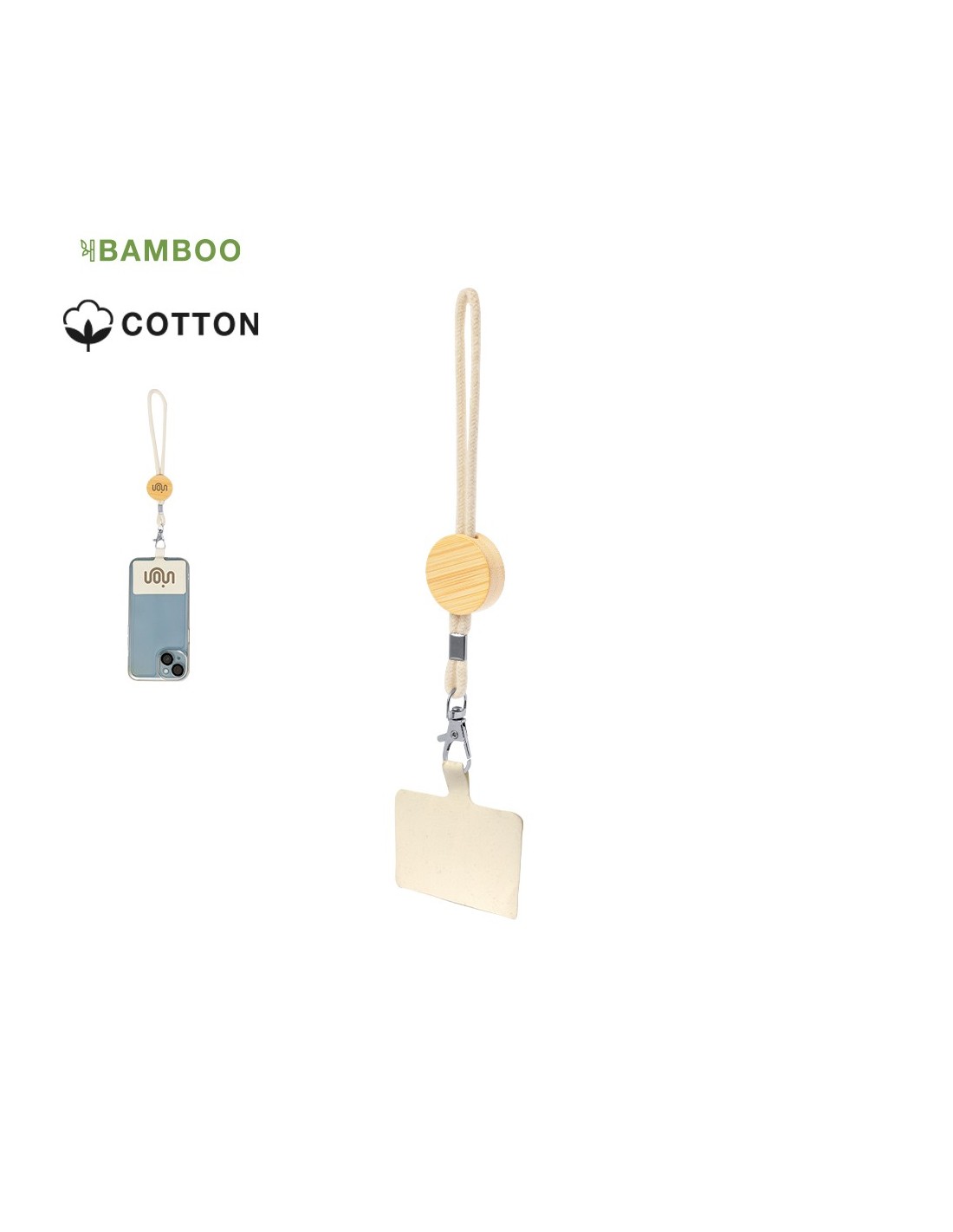 Original pulsera portamóvil en suave algodón, adaptable a todo tipo de muñecas. Con accesorio de transporte para situar entre la funda y el smartphone. Pieza central de bambú para personalización, especial para grabado en láser. Presentado individualmente en bolsa de papel reciclado..Materiales como el bambú fomentan la utilización de materias primas naturales, reduciendo las emisiones contaminantes. Proviene de una planta de gran resistencia y versatilidad, con crecimiento y regeneración rápidos, siendo una excelente alternativa al uso de madera tradicional.
