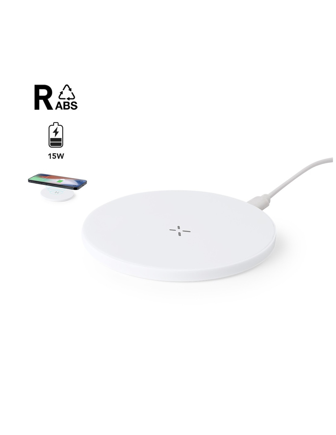 Cargador inalámbrico 15W de diseño circular fabricado en RABS. Compatible con dispositivos equipados con tecnología de carga inalámbrica Qi. Base antideslizante, con cable cargador Tipo C incluido. Presentado en caja individual de diseño kraft, con manual de instrucciones en español e inglés..El RABS es un plástico altamente reciclable de gran resistencia y con multitud de aplicaciones que lo convierten en una solución eco-friendly. Con certificación RCS, que garantiza el origen reciclado del mismo..Fabricado conforme a los estándares RoHS y en cumplimiento con los siguientes requisitos de seguridad:.Sistema de protección contra sobrecalentamiento..Sistema de protección contra sobrecarga..Sistema de bloqueo para evitar cortocircuitos.