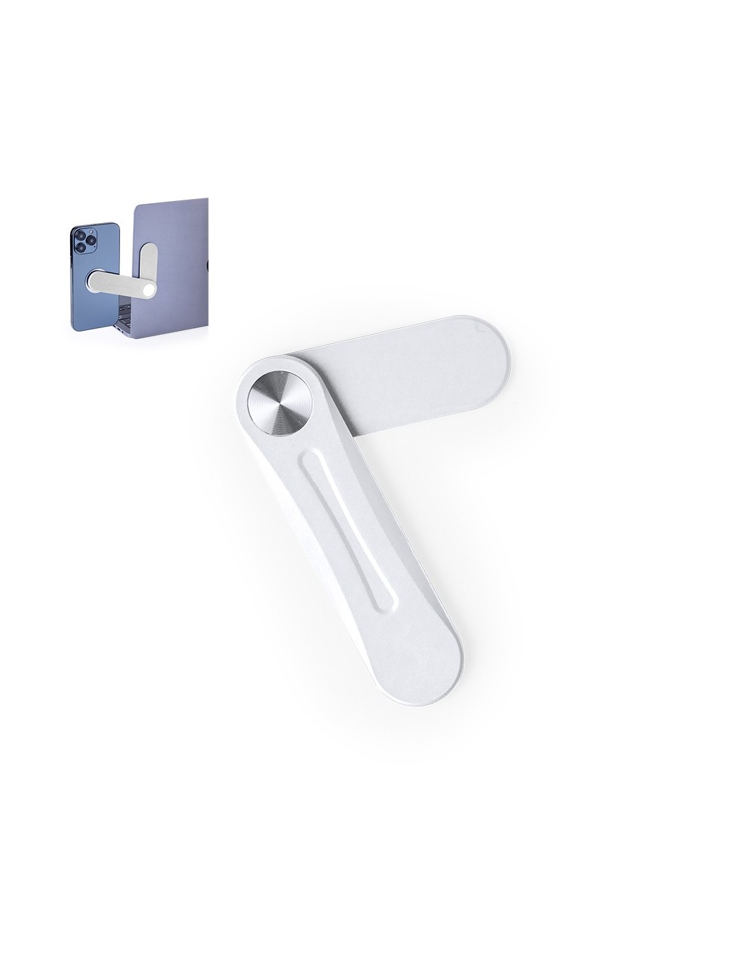 Soporte magnético plegable para smartphone, de diseño minimalista y elegante acabado. Brazo articulado ajustable en altura, con sistema de fijación por adhesivos. Presentado individualmente en bolsa de papel reciclada.