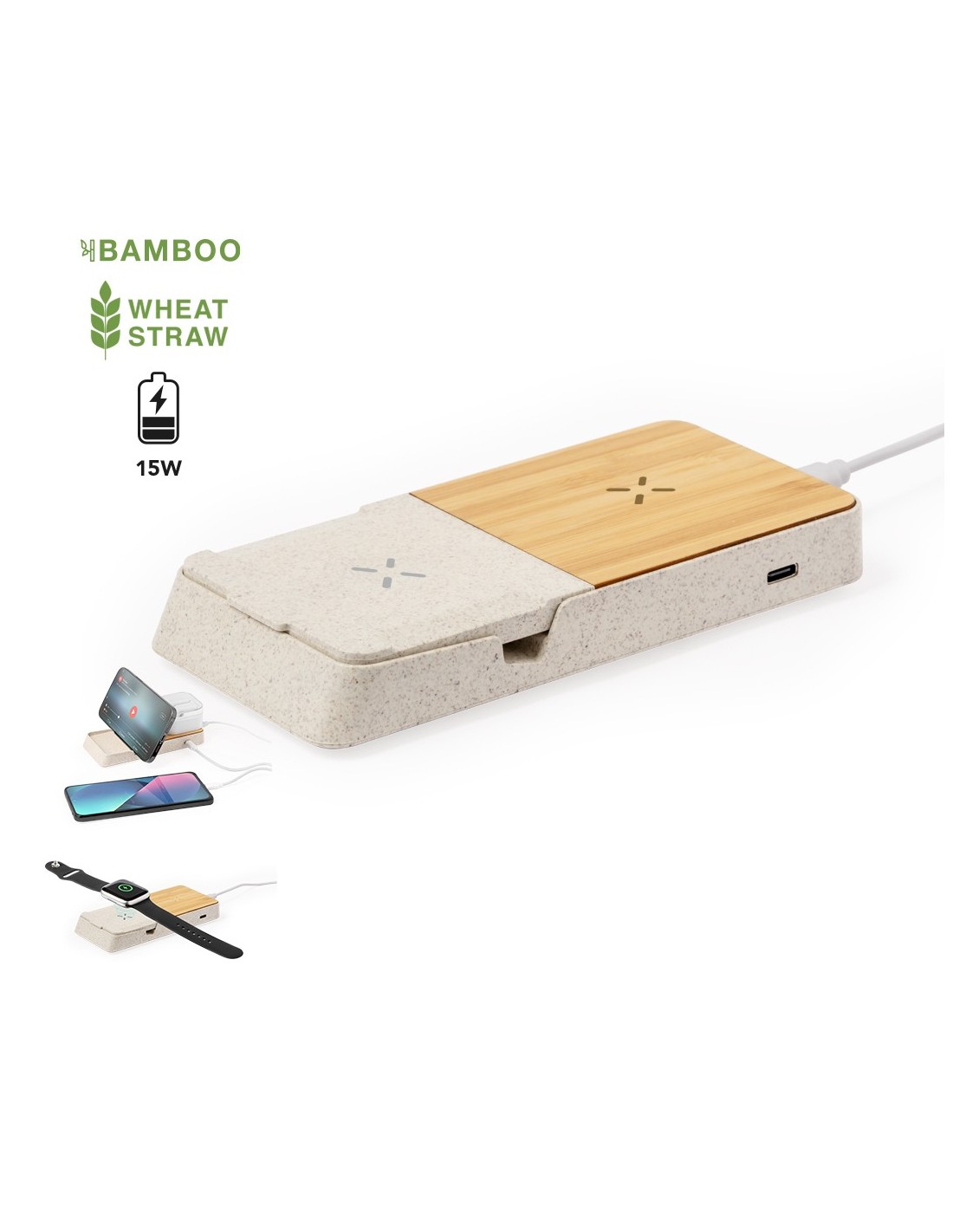 Completo cargador inalámbrico 15W con soporte fabricado en combinación de caña de trigo y bambú. Diseñado para la carga simultánea del smartphone o smartwatch, y auriculares, tanto de forma inalámbrica como a través de su puerto Tipo C: una estación de carga todo en uno, versátil y con soporte para smartphone o tablet. Presentada en atractiva caja individual de diseño kraft y disponible manual de instrucciones en español e inglés..La caña de trigo fomenta la utilización de materias primas naturales, reduciendo así las emisiones contaminantes..Materiales como el bambú fomentan la utilización de materias primas naturales, reduciendo las emisiones contaminantes. Proviene de una planta de gran resistencia y versatilidad, con crecimiento y regeneración rápidos, siendo una excelente alternativa al uso de madera tradicional..Fabricado conforme a los estándares RoHS y en cumplimiento con los siguientes requisitos de seguridad:.Sistema de protección contra sobrecalentamiento..Sistema de protección contra sobrecarga..Sistema de bloqueo para evitar cortocircuitos.