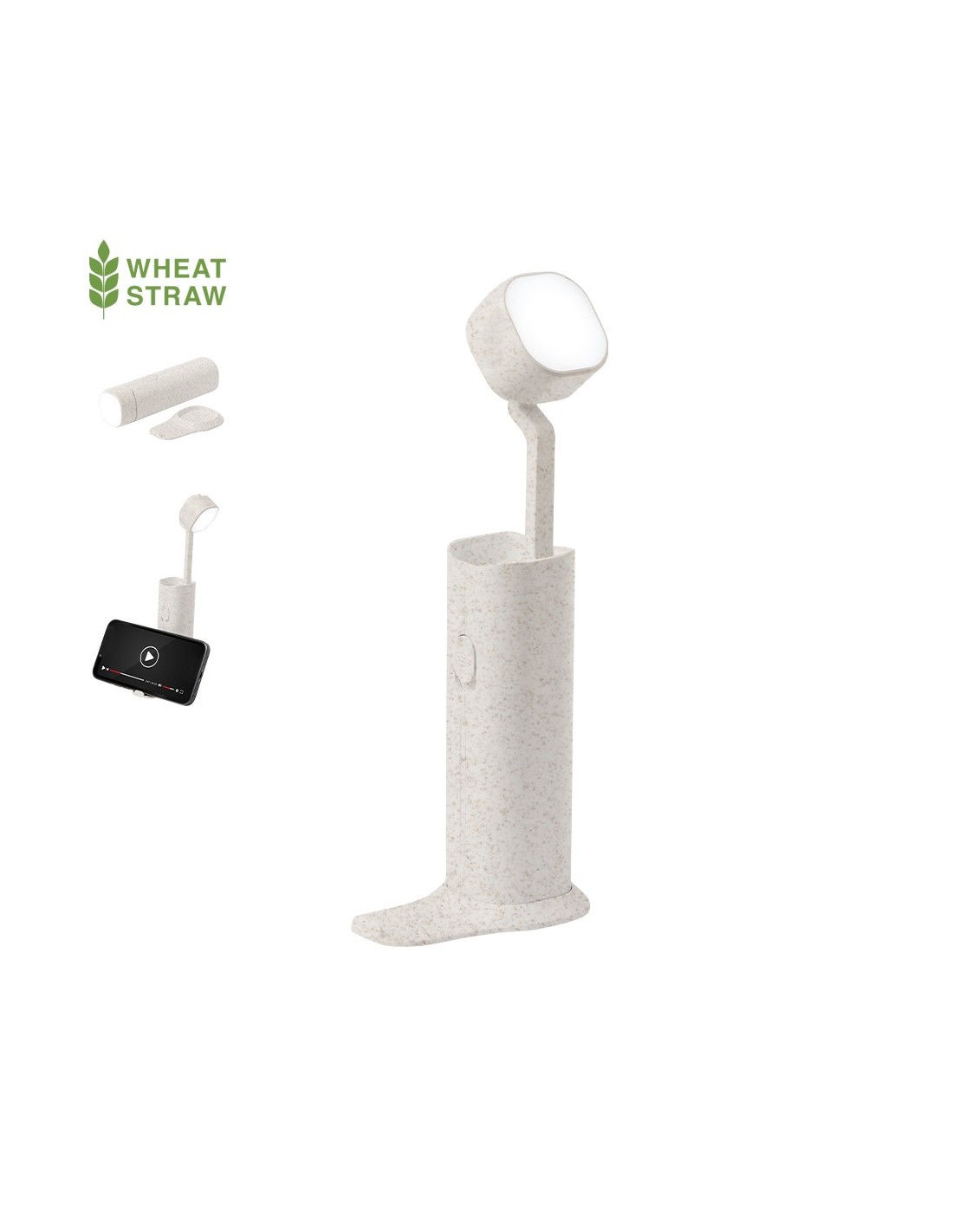 Lámpara multifunción fabricada en caña de trigo. Incluye 12 LEDs de intensidad regulable, es plegable y ajustable en altura. Incluye soporte para dispositivos móviles y tiene base antideslizante, con cable cargador Micro USB incluido. Disponible manual de instrucciones en español e inglés y presentada en caja de diseño kraft..La caña de trigo fomenta la utilización de materias primas naturales, reduciendo así las emisiones contaminantes..Fabricada conforme a los estándares RoHS y en cumplimiento con los siguientes requisitos de seguridad:.Sistema de protección contra sobrecalentamiento..Sistema de protección contra sobrecarga..Sistema de bloqueo para evitar cortocircuitos.