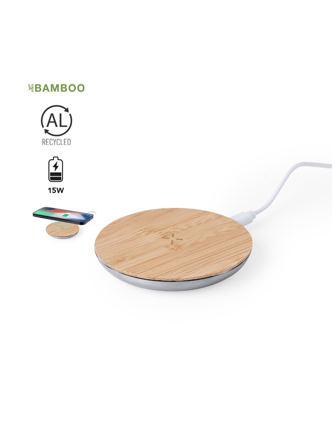 Cargador inalámbrico 15W de diseño circular, con cuerpo fabricado en Aluminio Reciclado y base de carga en bambú. Compatible con dispositivos equipados con tecnología de carga inalámbrica Qi, con cable de carga Tipo C incluido e indicador LED de estado de carga. Base antideslizante y presentado en caja individual de diseño kraft, con manual de instrucciones en español e inglés..Materiales como el bambú fomentan la utilización de materias primas naturales, reduciendo las emisiones contaminantes. Proviene de una planta de gran resistencia y versatilidad, con crecimiento y regeneración rápidos, siendo una excelente alternativa al uso de madera tradicional..El Aluminio Reciclado es un material con posibilidades de reciclaje casi infinitas, sin perder sus propiedades originales y consumiendo menos energía en este proceso..Certificación GRS (Global Recycled Standard / Estándar de Reciclaje Global), que garantiza el origen reciclado del material usado para fabricar el producto..Fabricado conforme a los estándares RoHS y en cumplimiento con los siguientes requisitos de seguridad:.Sistema de protección contra sobrecalentamiento..Sistema de protección contra sobrecarga..Sistema de bloqueo para evitar cortocircuitos..