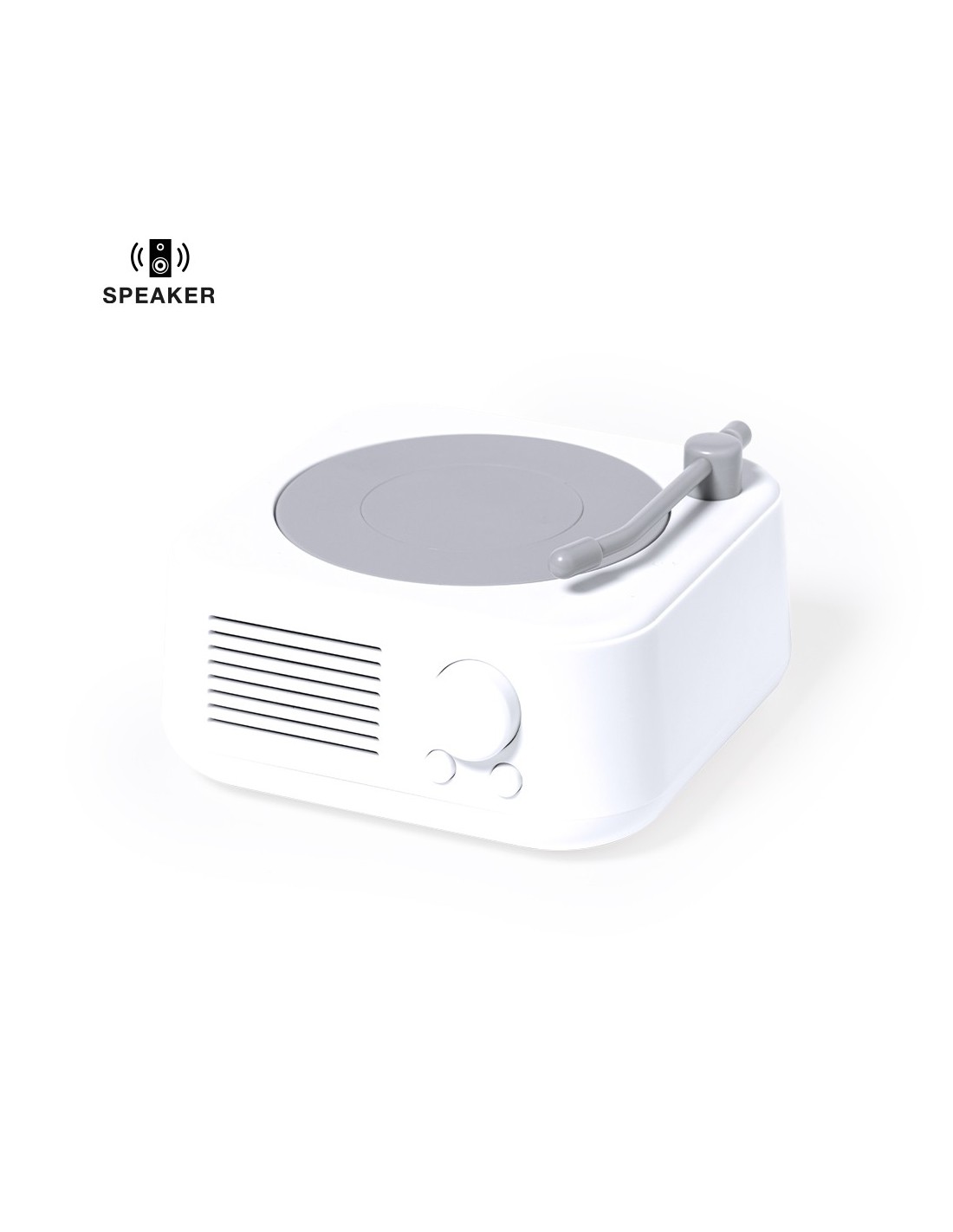 Altavoz Bluetooth® en original forma de tocadiscos, de tamaño compacto y 5W de potencia. Batería de litio de 800mAh, con cable de carga Tipo C incluido e indicador luminoso de estado de carga. Función manos libres y radio FM, con ranura para tarjetas micro SD de hasta 32 GB de capacidad y una entrada auxiliar para conector jack de 3,5 mm. Fabricado en resistente ABS blanco con detalles en gris y presentado en caja individual de diseño kraft, con manual de instrucciones en español e inglés.