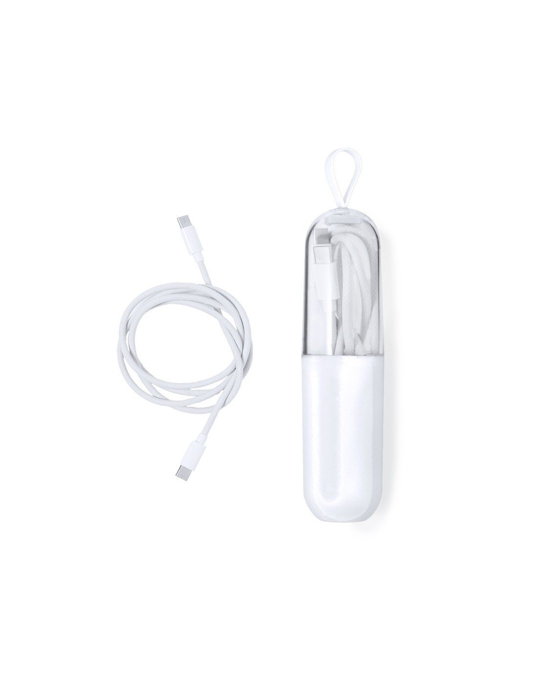 Cable cargador con conexión dual Tipo C. De 65W de potencia y apto para transferir datos. 100cm de longitud, con conectores de aluminio y presentado en atractivo estuche con una parte transparente y otra opaca. Con asa de transporte y presentado individualmente en bolsa reciclada.