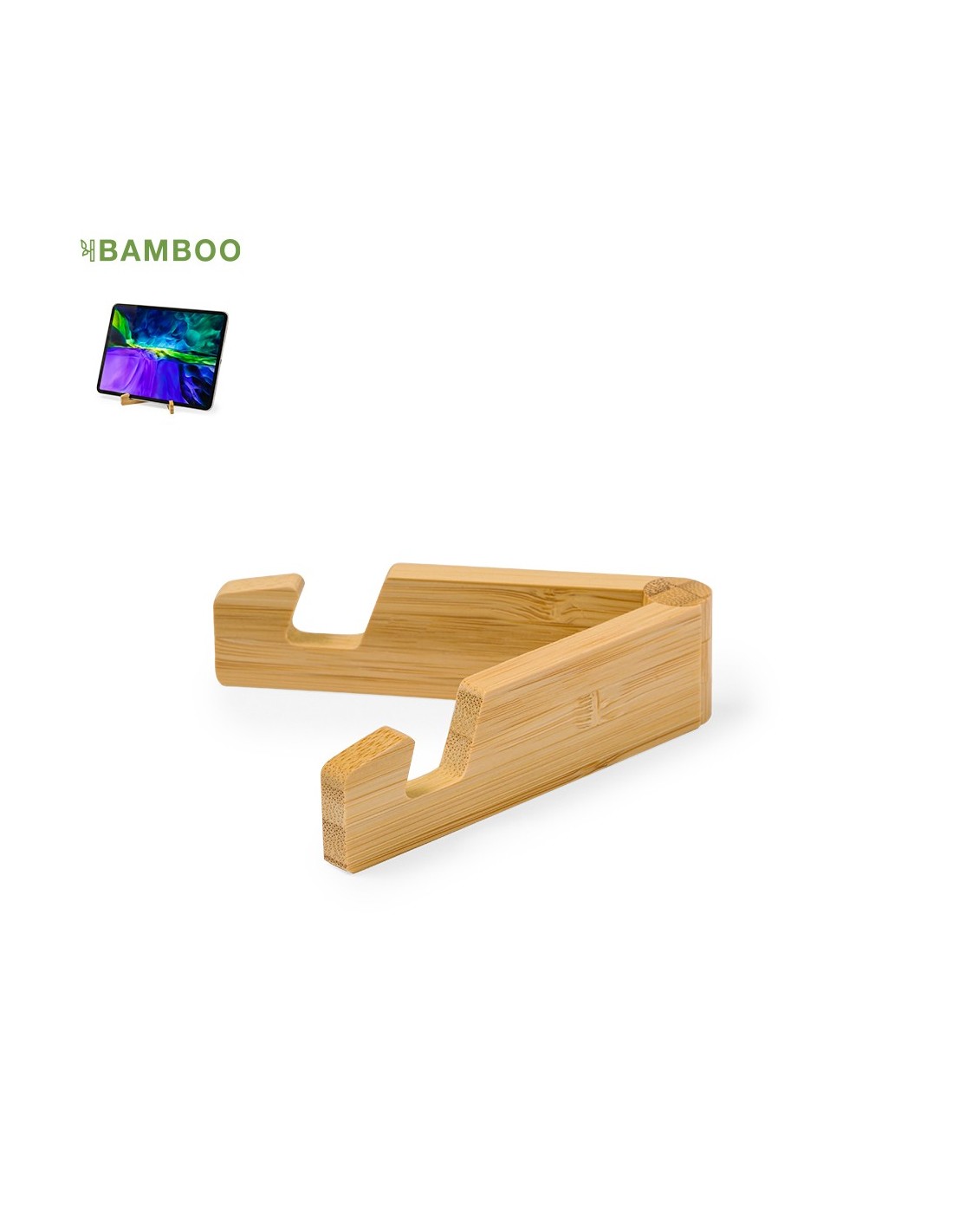 Soporte plegable para dispositivo móvil fabricado en resistente bambú. Con patas ajustables y presentado individualmente en bolsa de papel reciclado. .Materiales como el bambú fomentan la utilización de materias primas naturales, reduciendo las emisiones contaminantes. Proviene de una planta de gran resistencia y versatilidad, con crecimiento y regeneración rápidos, siendo una excelente alternativa al uso de madera tradicional.