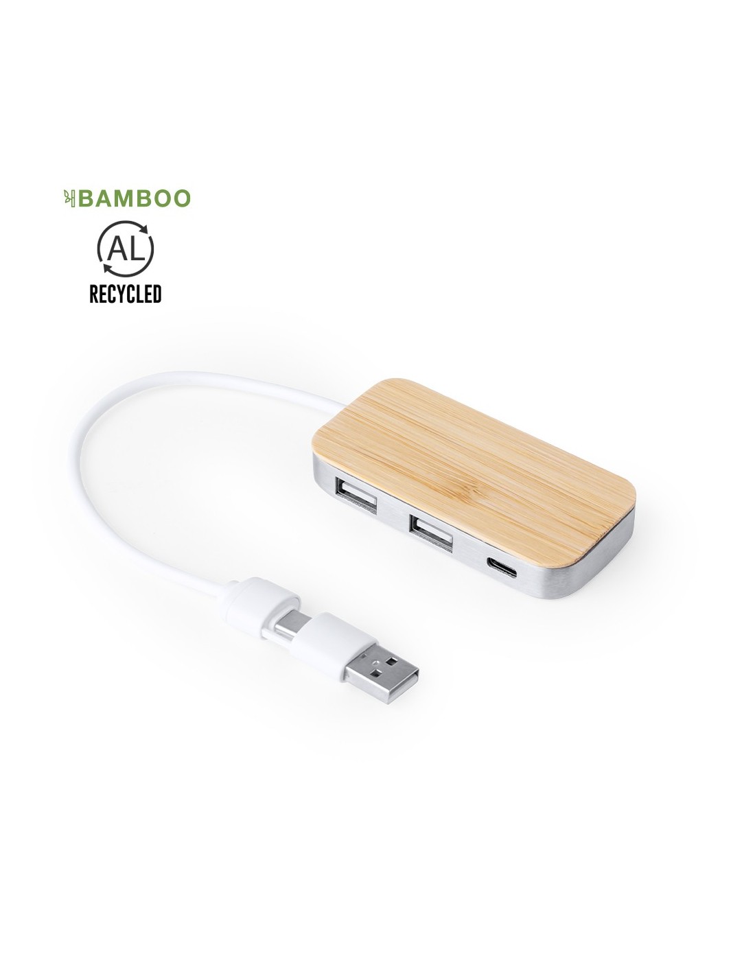 Puerto USB 2.0 fabricado en Aluminio Reciclado con superficie en bambú. Incluye puerto Tipo C y 2 puertos USB, con entrada dual USB/Tipo C. Presentado en caja individual de diseño kraft..Fabricado conforme a estándares RoHS, con sistema de bloqueo para evitar cortocircuitos..El Aluminio Reciclado es un material con posibilidades de reciclaje casi infinitas, sin perder sus propiedades originales y consumiendo menos energía en este proceso..Certificación GRS (Global Recycled Standard / Estándar de Reciclaje Global), que garantiza el origen reciclado del material usado para fabricar el producto..Materiales como el bambú fomentan la utilización de materias primas naturales, reduciendo las emisiones contaminantes. Proviene de una planta de gran resistencia y versatilidad, con crecimiento y regeneración rápidos, siendo una excelente alternativa al uso de madera tradicional.