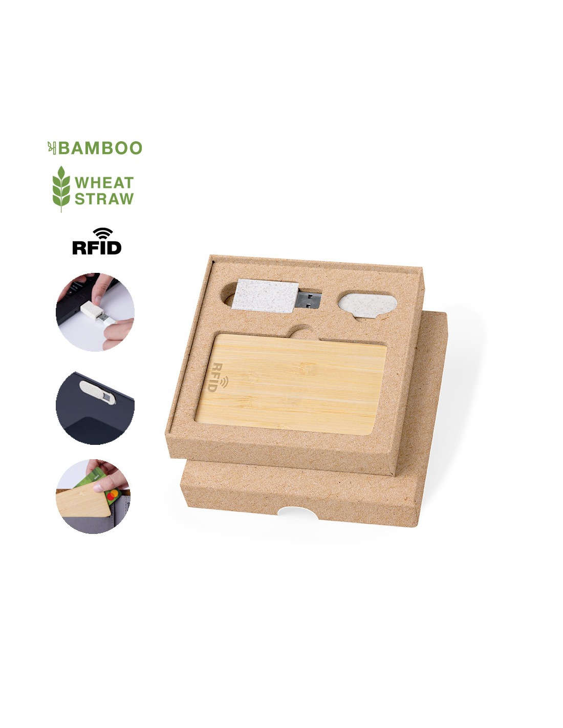 Práctico set de seguridad y privacidad. Incluye una tarjeta con protección de RFID fabricada en bambú, tapa webcam fabricada en caña de trigo y un bloqueador de datos fabricado en caña de trigo, evitando el traspaso de datos y permitiendo cargar el dispositivo. Presentado en elegante caja con compartimento troquelado para cada accesorio. .Materiales como el bambú fomentan la utilización de materias primas naturales, reduciendo las emisiones contaminantes. Proviene de una planta de gran resistencia y versatilidad, con crecimiento y regeneración rápidos, siendo una excelente alternativa al uso de madera tradicional.
